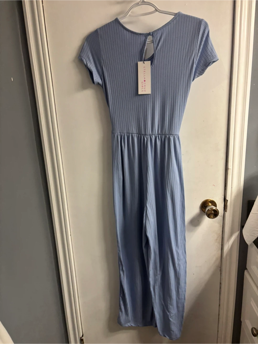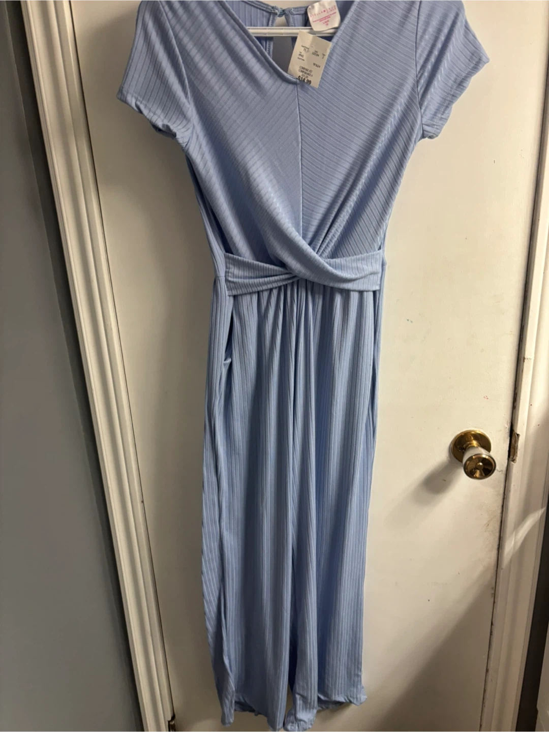 This is a blue, ribbed jumpsuit with short sleeves and a tie waist. It's made of a soft, stretchy material. It has pockets on the sides.
