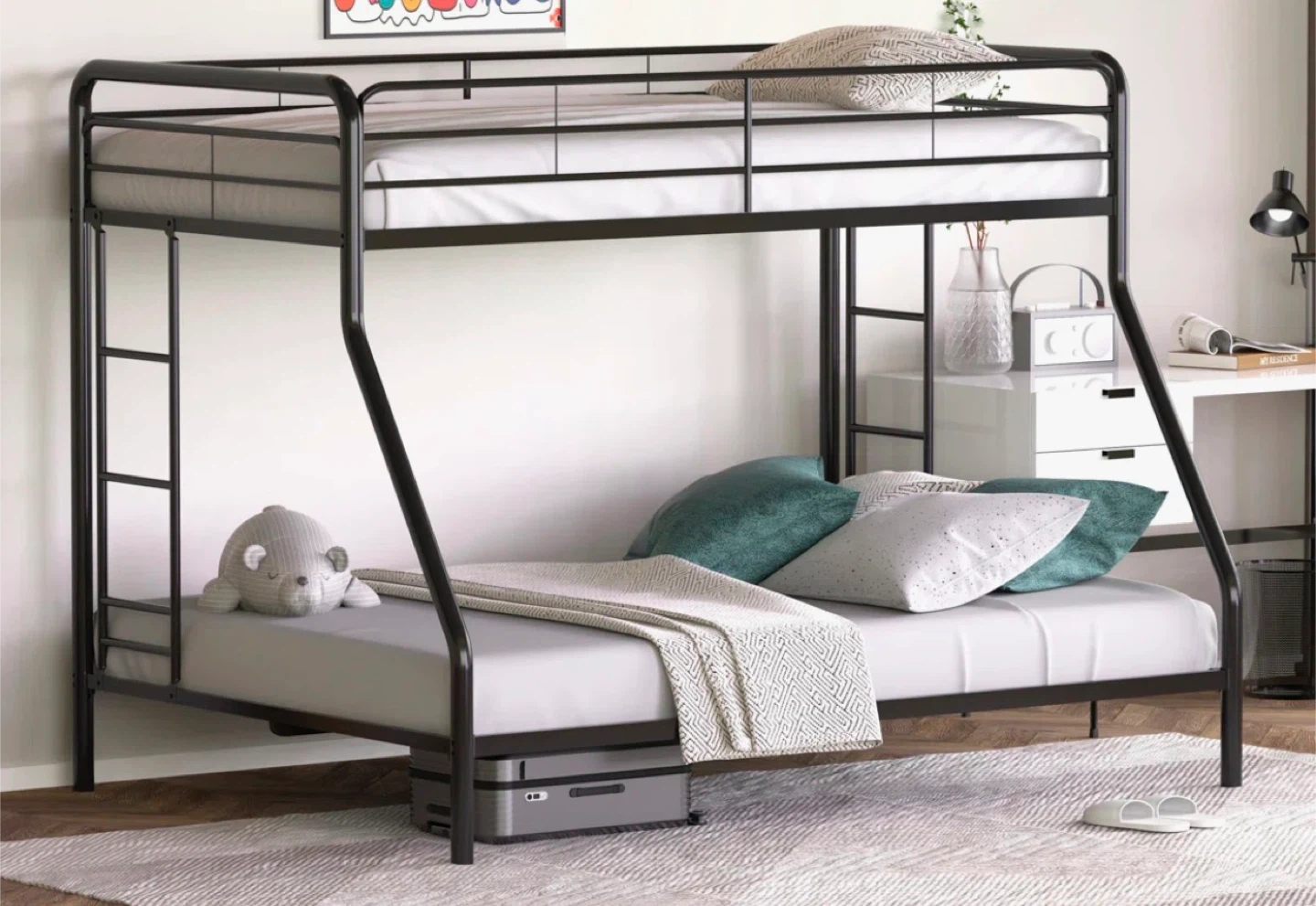 This blue metal bunk bed frame is built for durability. It includes a ladder for easy access to the top bunk. Twin over full configuration provides ample sleeping space. Perfect for maximizing room space!