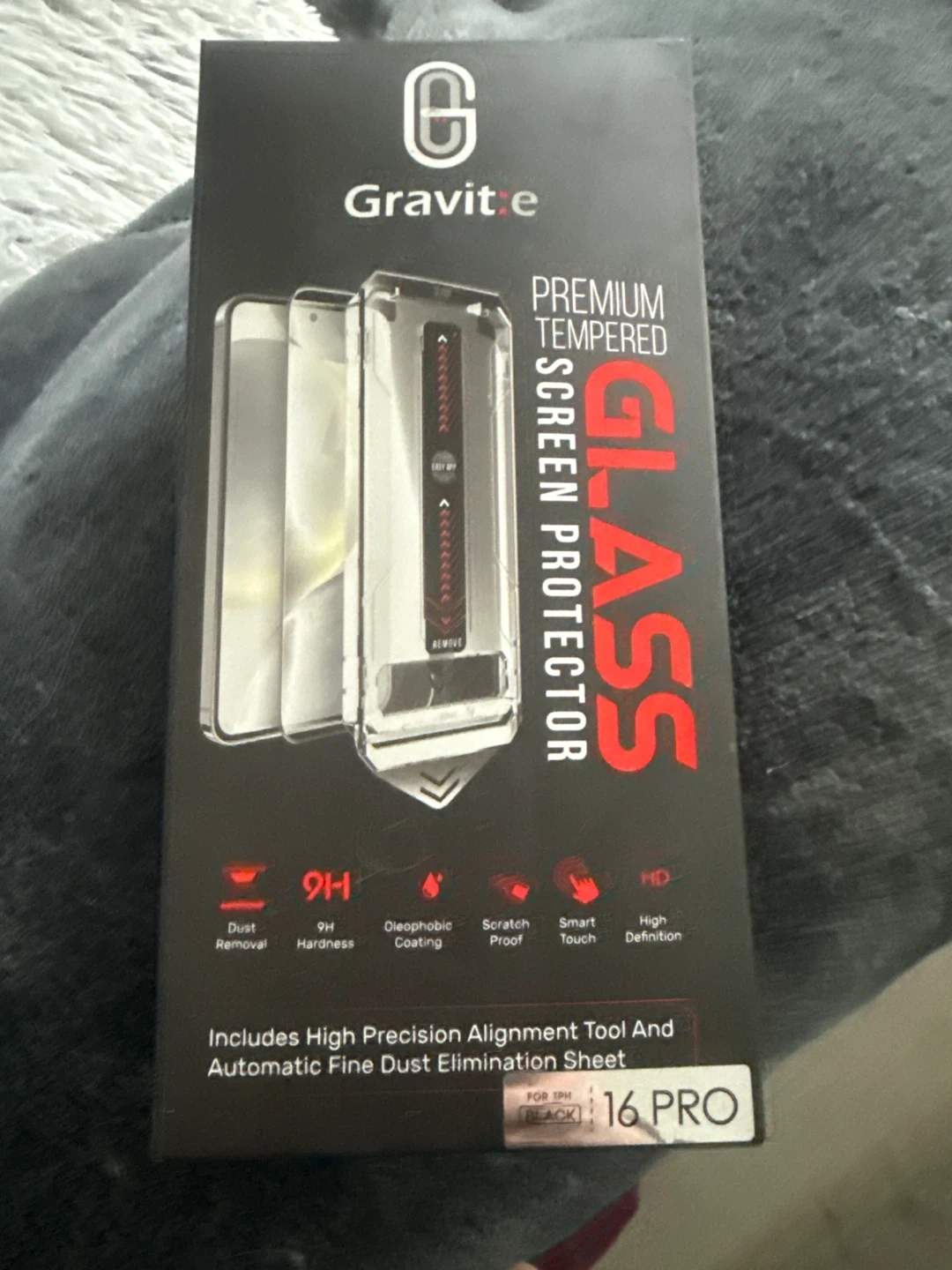 This is a premium tempered glass screen protector for the 16 Pro. It features 9H hardness and scratch proofing. The package includes a high precision alignment tool and an automatic fine dust elimination sheet.