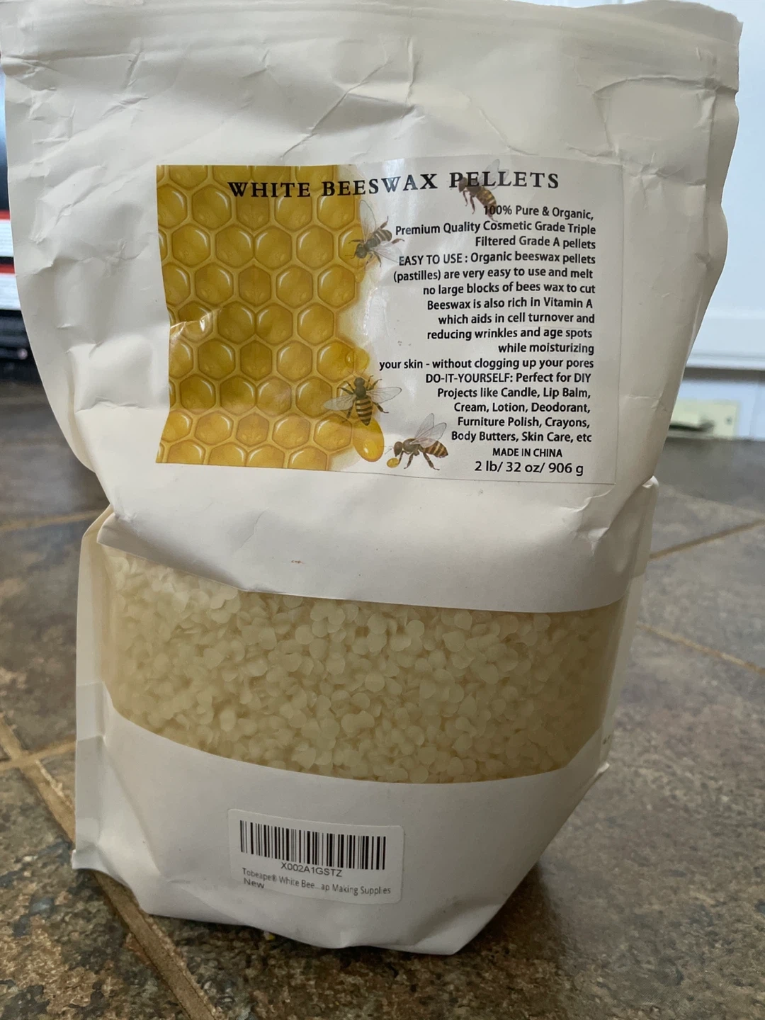 Opened bag of organic beeswax pellets, 3/4 full. These cosmetic-grade pellets are filtered and easy to melt, perfect for DIY projects like candles, lip balms, creams, and lotions. The beeswax is also rich in Vitamin A and helps moisturize skin.