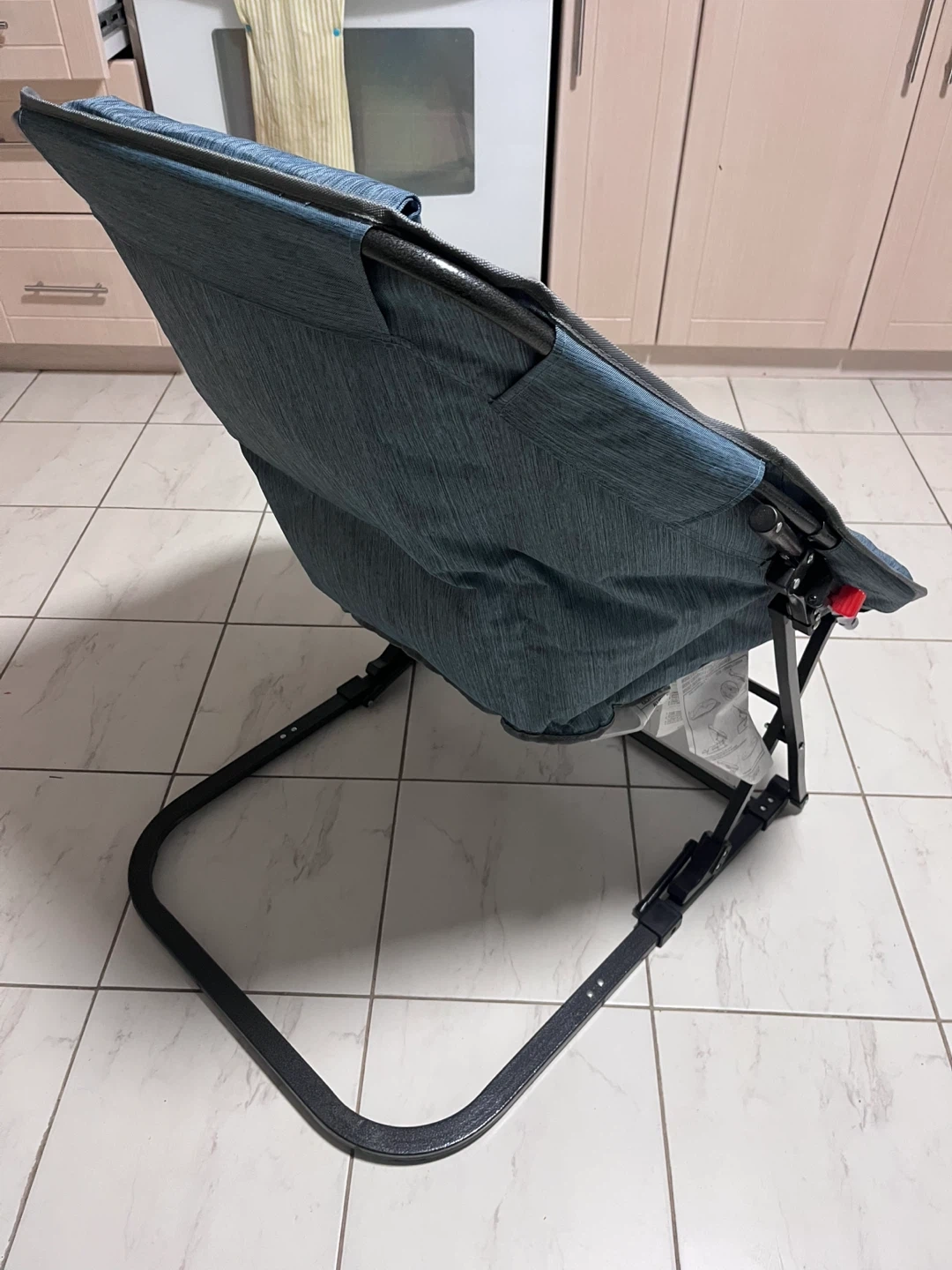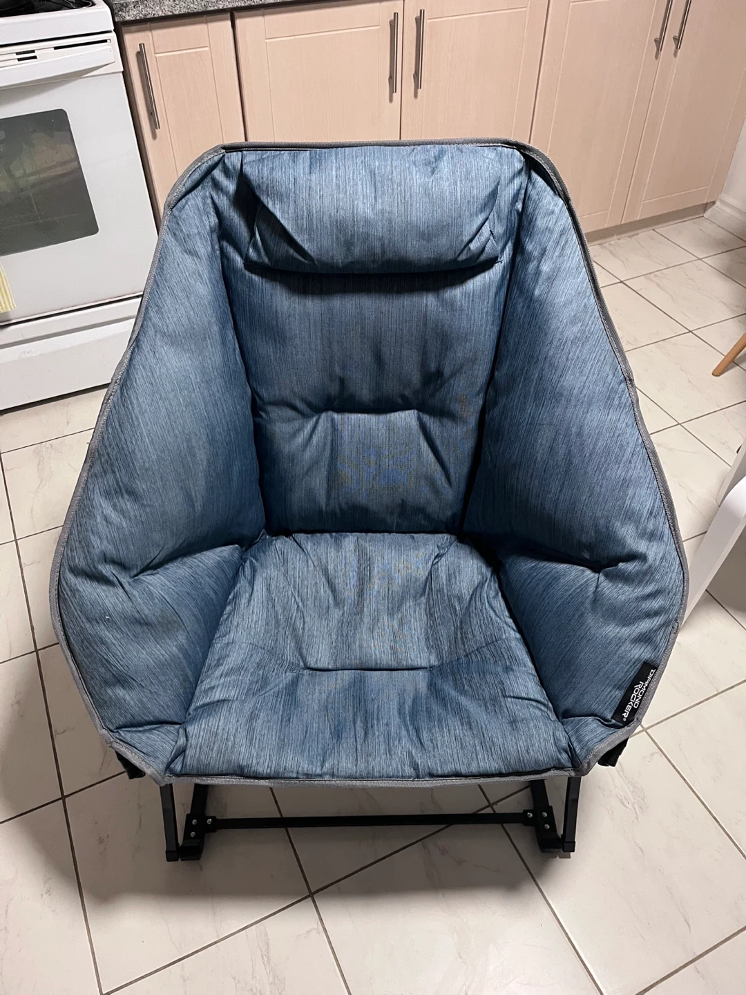 This is a comfortable blue Aero D'ar portable camping chair. It's made of durable fabric with a sturdy metal frame, perfect for outdoor adventures. Folds up easily for transport!