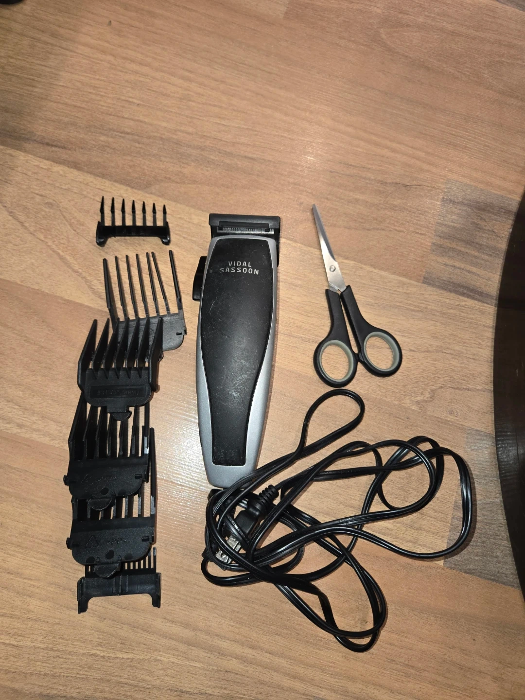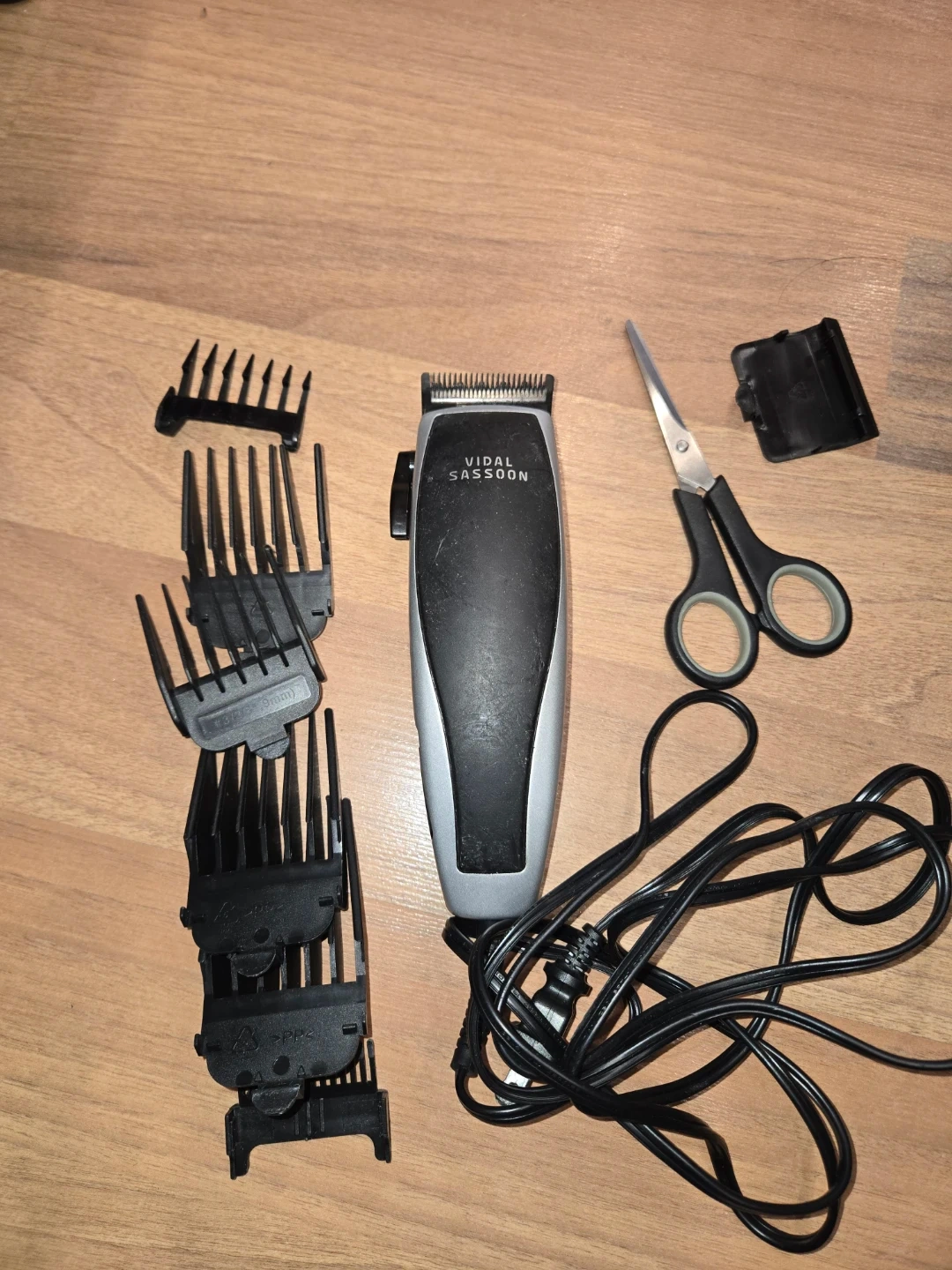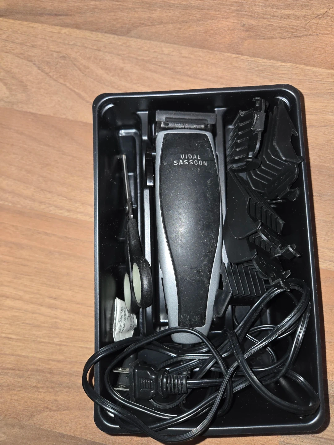 This Vidal Sassoon hair clipper set includes the clipper, multiple guide combs, and scissors. It comes in a storage case for easy organization. The set is ready for your home grooming needs!
