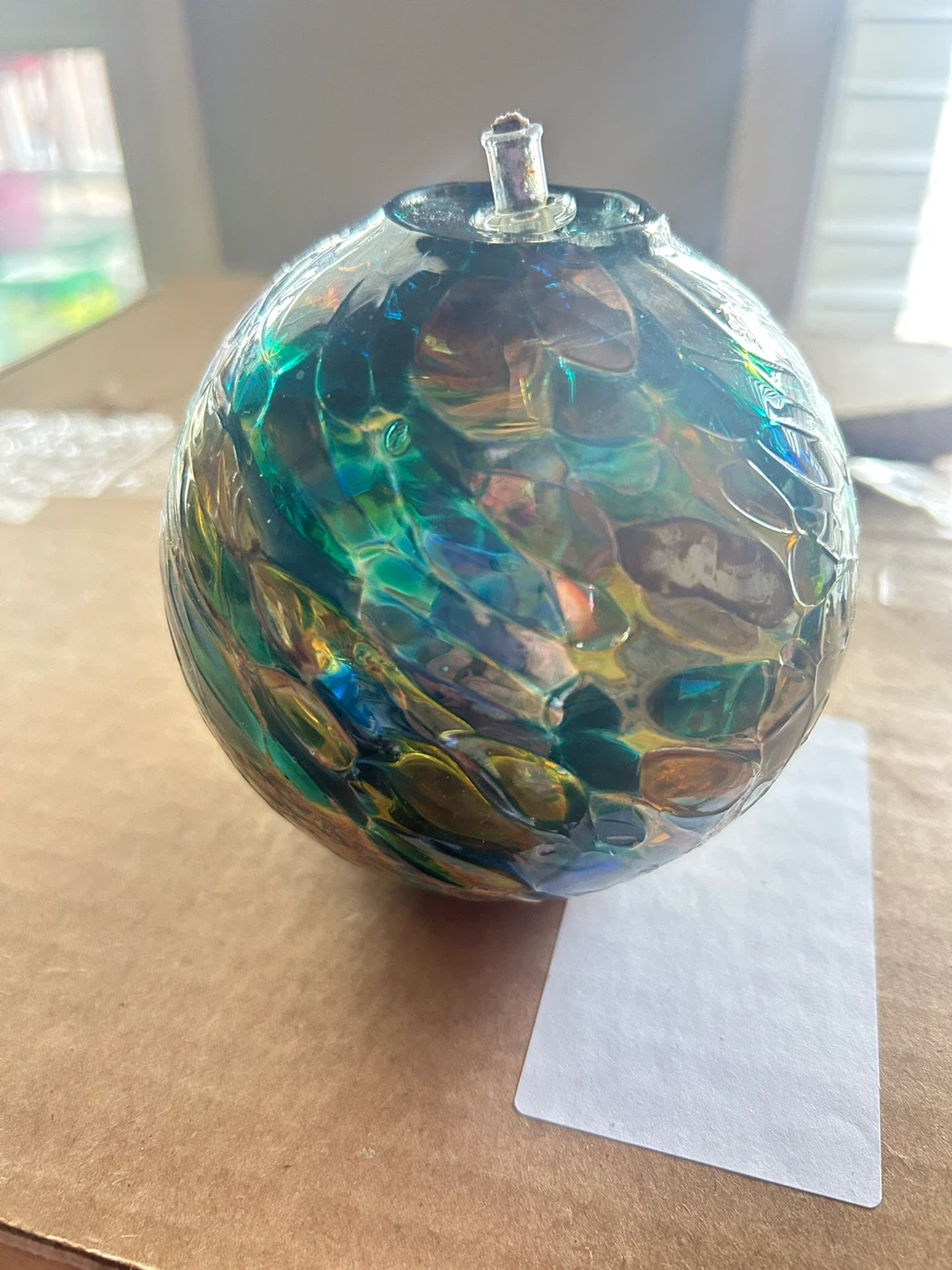 Beautiful hand-blown glass oil lamp with a swirling blue, green, and amber design. It's perfect for adding a touch of ambiance to any room. The lamp is made of glass and comes with a wick ready for use.
