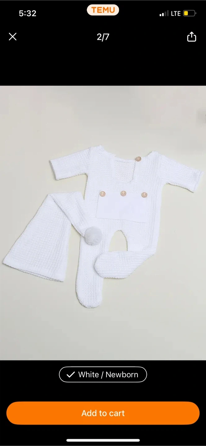 This soft, white newborn outfit is perfect for photoshoots. It's a cosy, knitted romper with a matching long-tail hat and a decorative pocket. Includes a cute pom-pom detail on the hat.