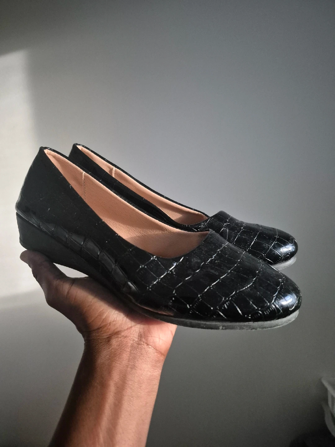Selling a pair of black flats in size 8US / 40EU. They have a stylish crocodile-like texture and are in good condition.