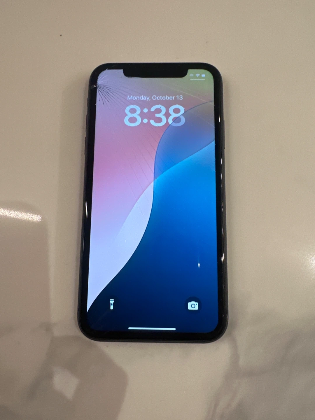 Selling a black iPhone 11 with 64GB of storage. The screen has a crack, as shown in the pictures. Otherwise, it's in good working condition! Also selling 3 phone cases with the phone. Does not come with a box or charger.