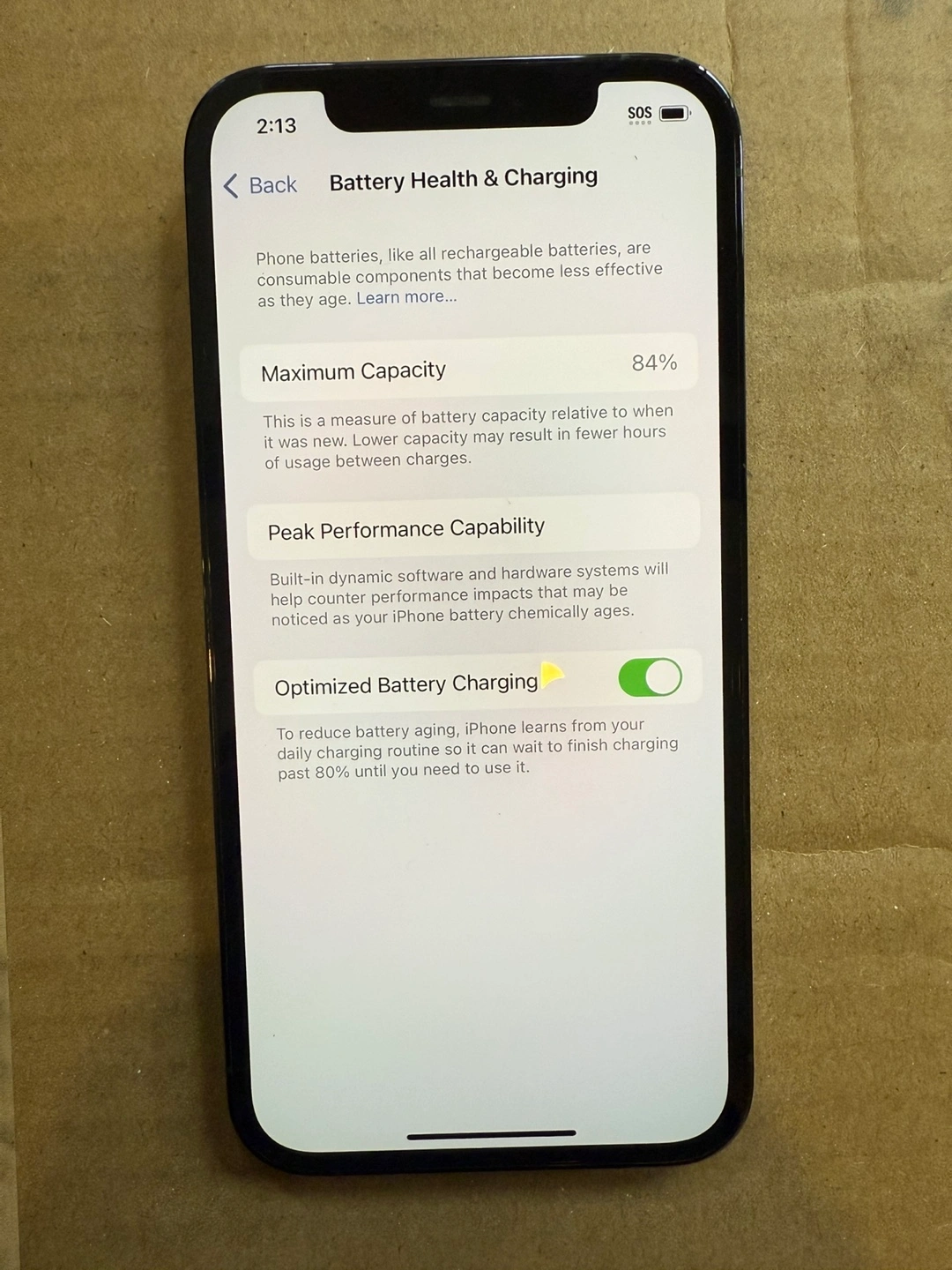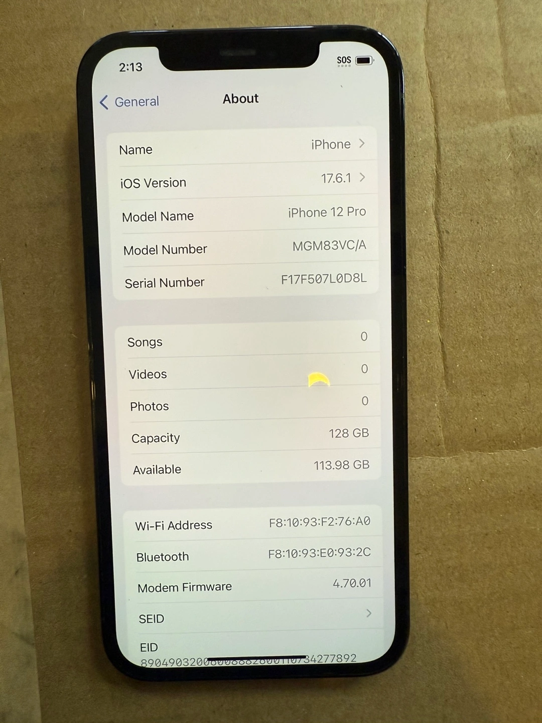 Selling an iPhone 12 Pro with 128GB of storage. The battery health is at 84%. It's running iOS version 17.6.1. Model number is MGM83VC/A.