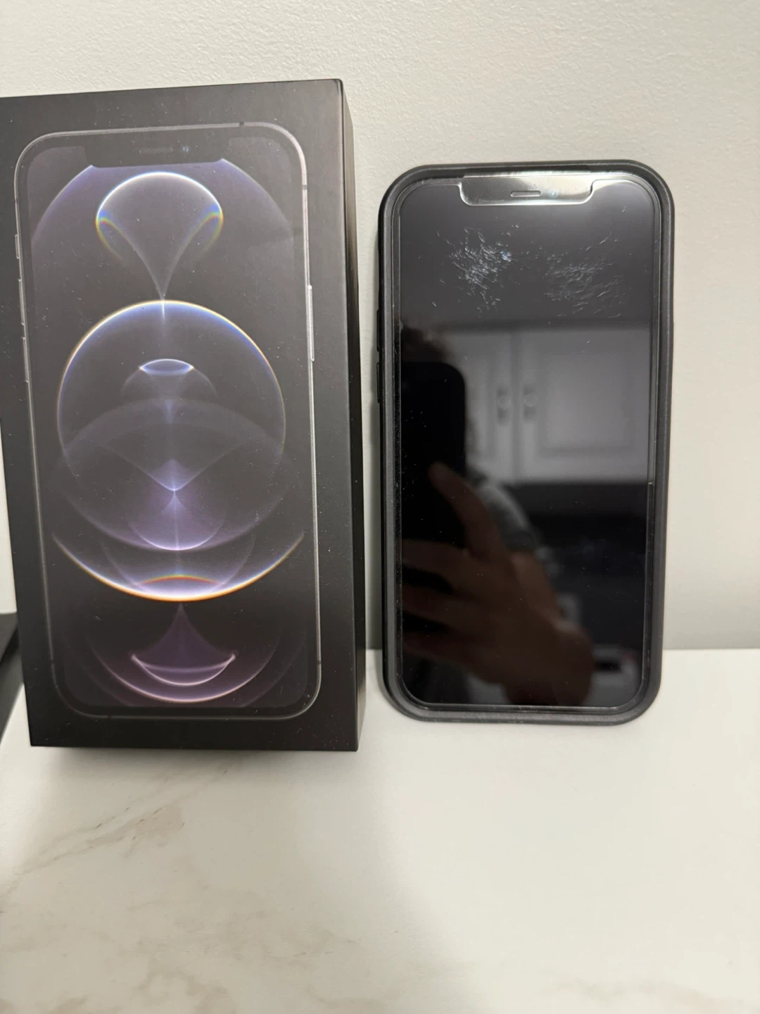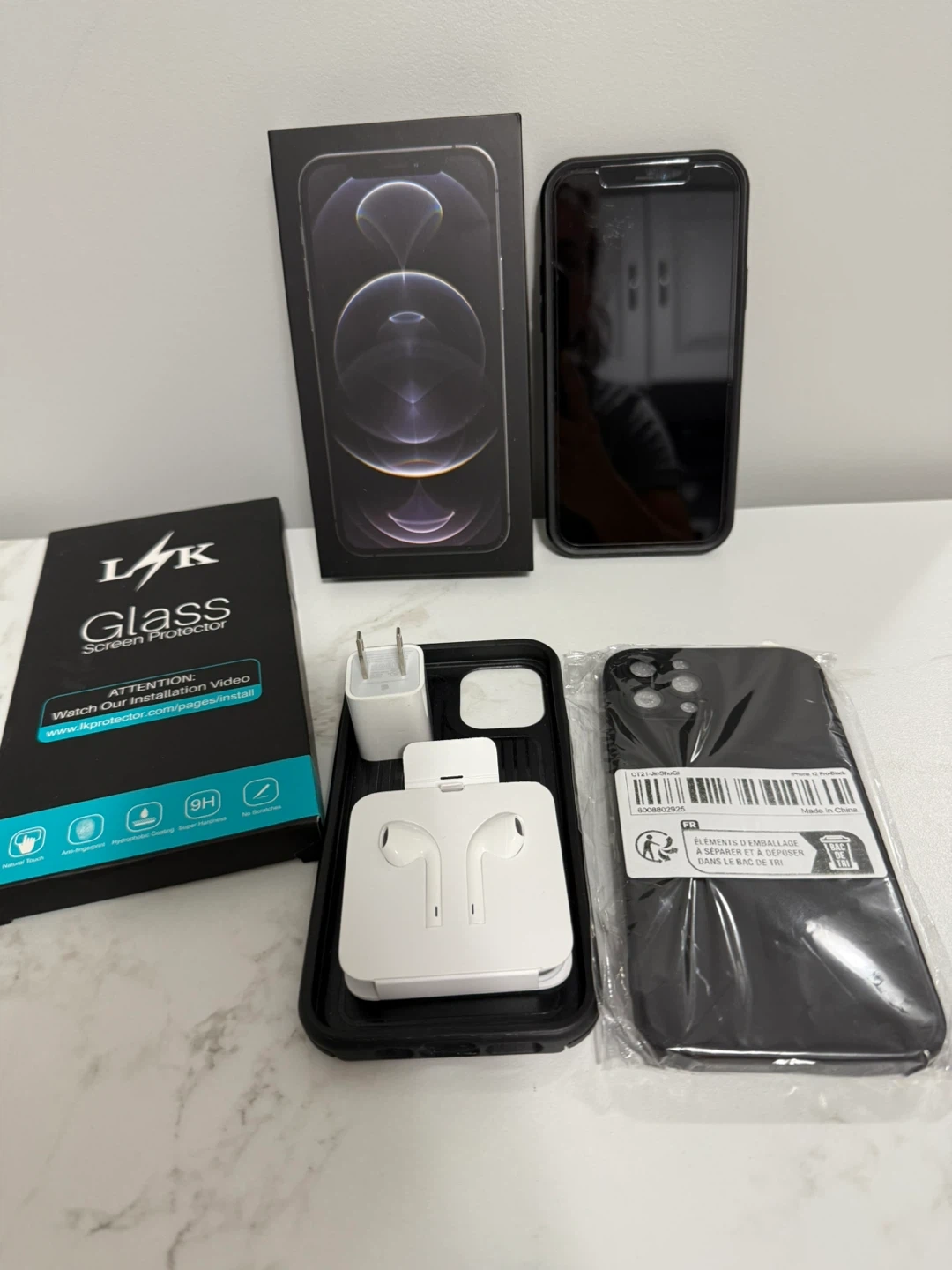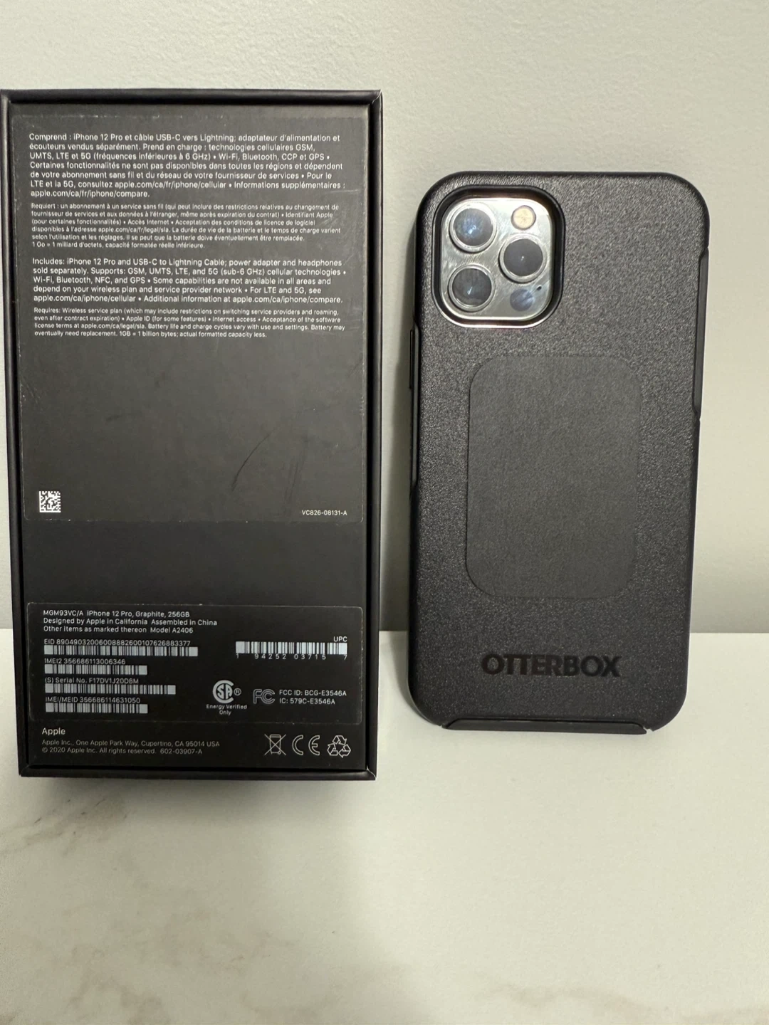 62iPhone 12 Pro Size: 256gb colour: graphite Battery: 74% No scratches always had case and screen protector on Original box included Brand new power cord, wall plug and even includes brand new wired headphones 3 cases included, 2 of them are otterboxes 3 glass privacy screens are included as well Excellent condition and ready to use without having to buy anything else when all is included and more