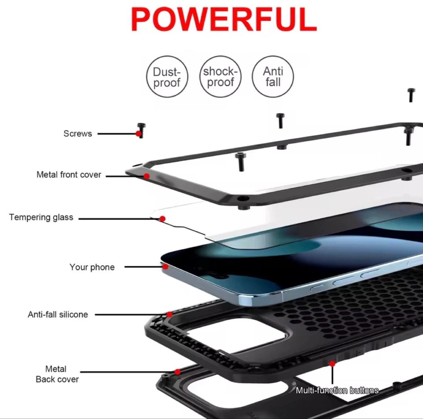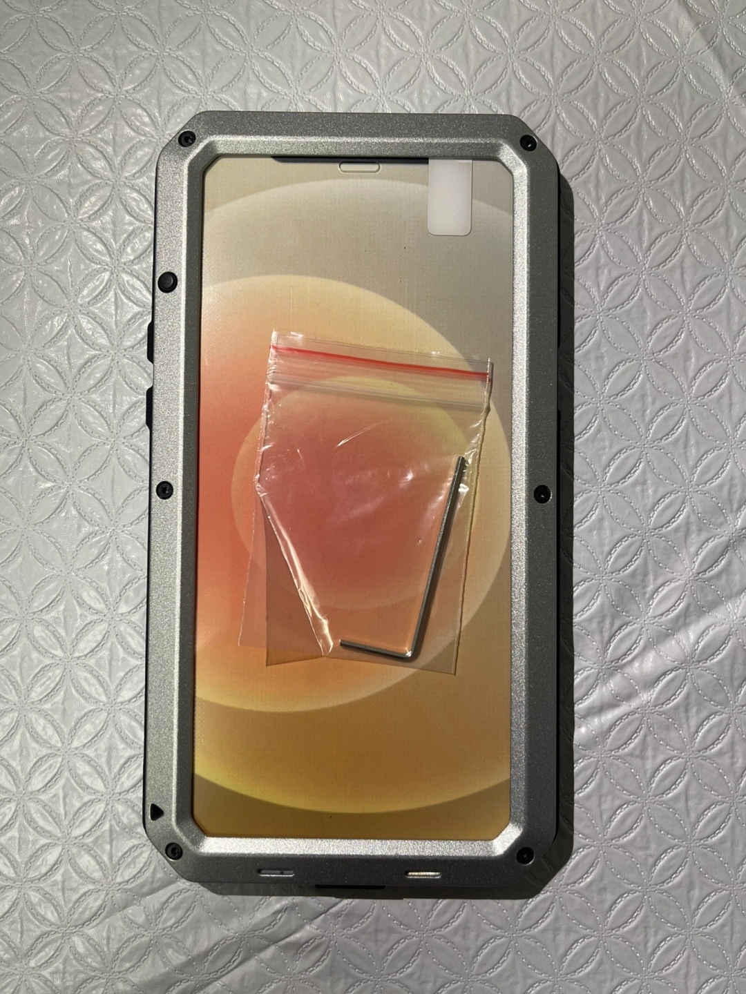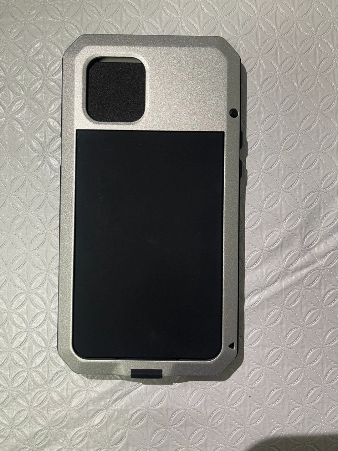 Durable metal phone case. Silver colour. Includes screen protector and small tool. For iPhone 12 Pro Max. Never used