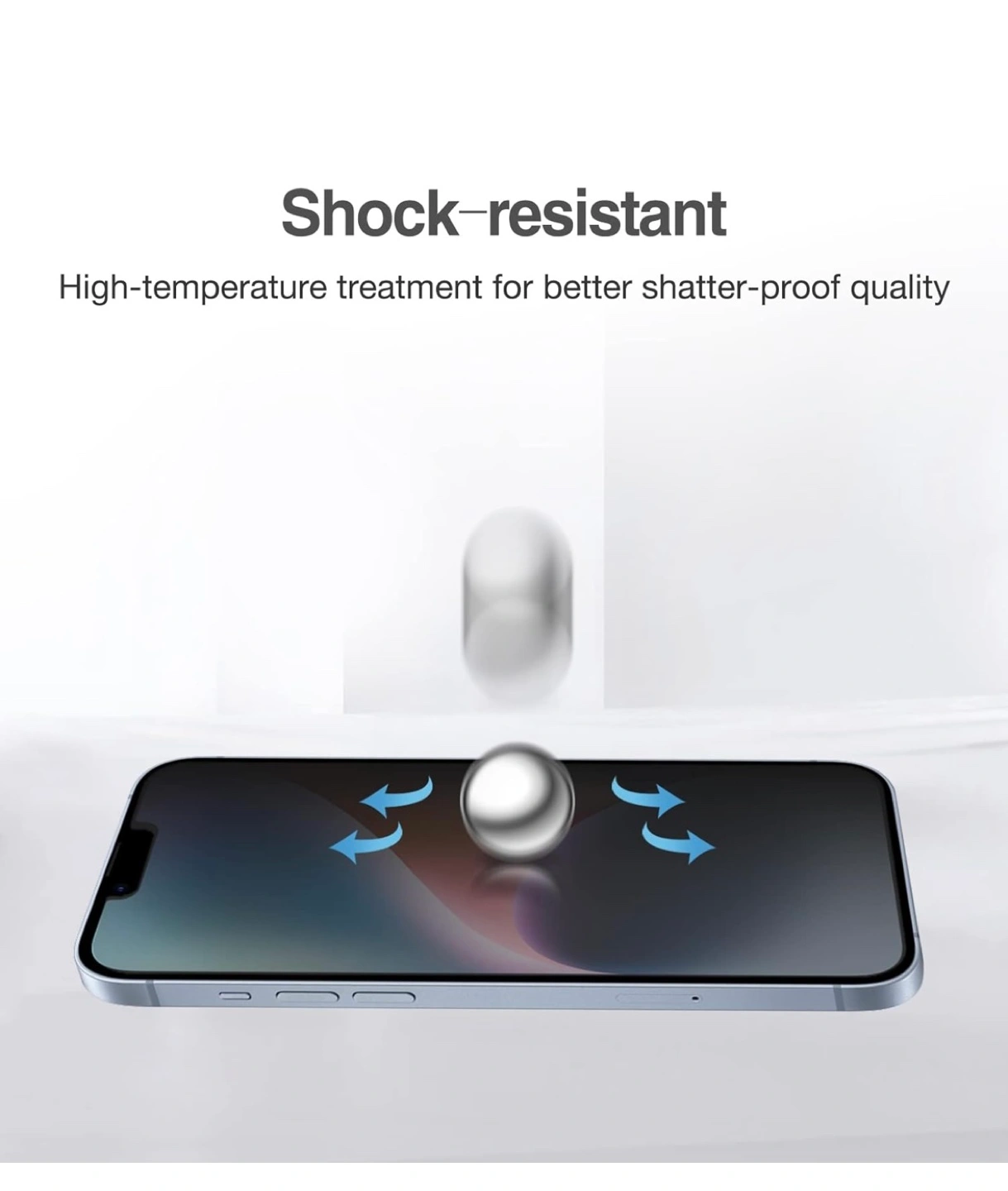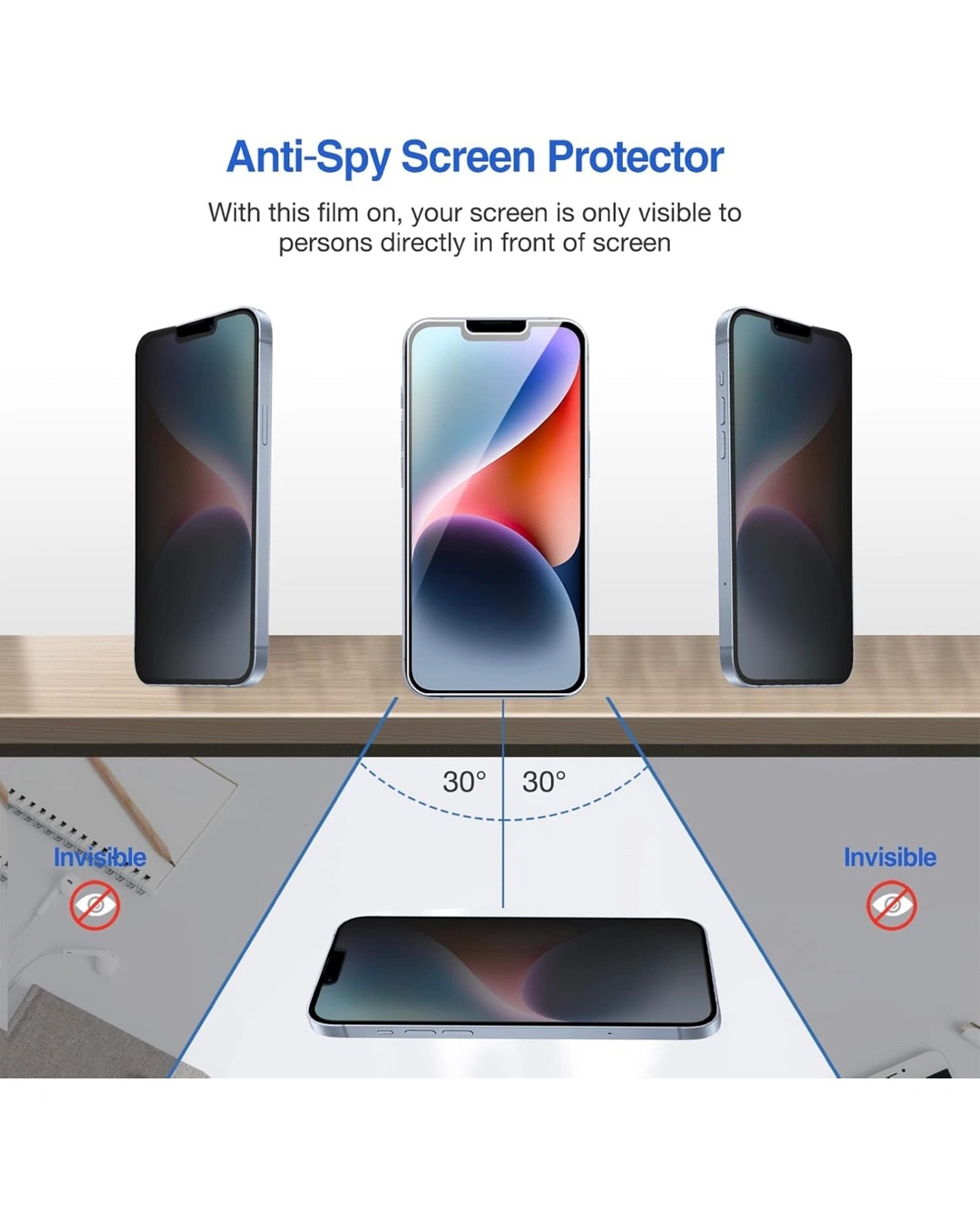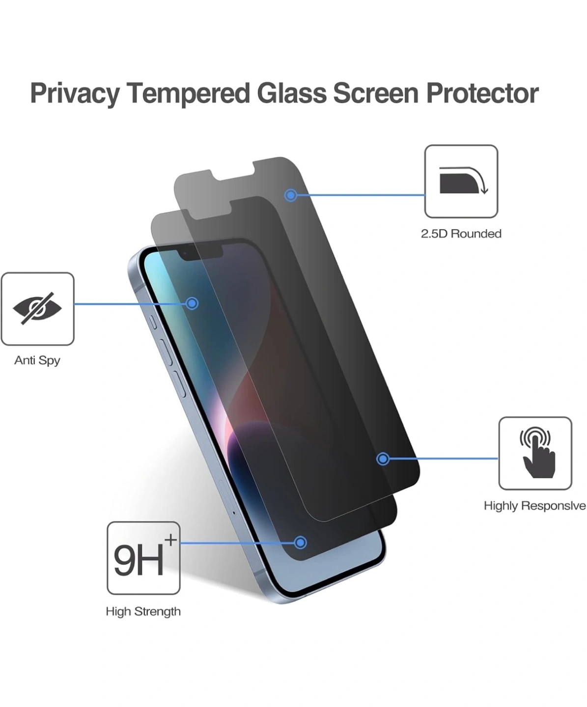 Two-pack anti-spy dark screen protectors. 9H+ high strength tempered glass. 2.5D rounded edges. Highly responsive. Compatible with iPhone 14 6.1" 2022, iPhone 13/13 Pro 6.1" 2021. Buble free