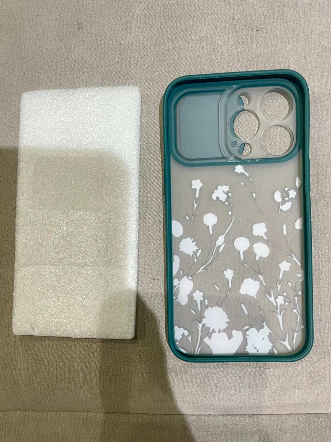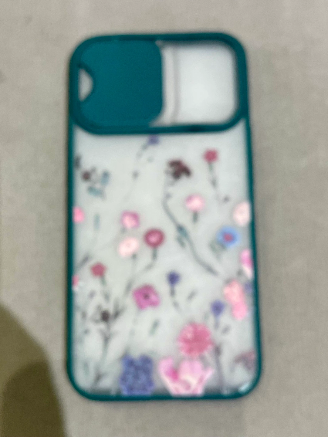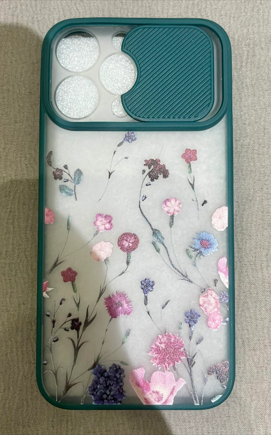 Pretty floral phone case. Green border. Camera lens cover. Soft material. For iPhone 13 Pro.