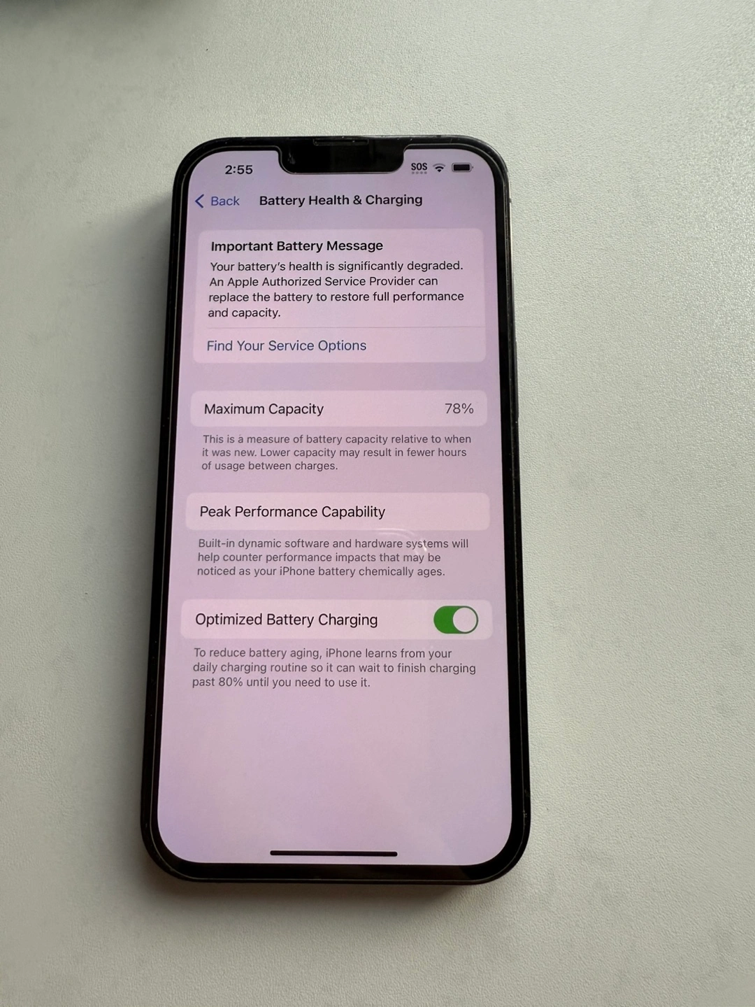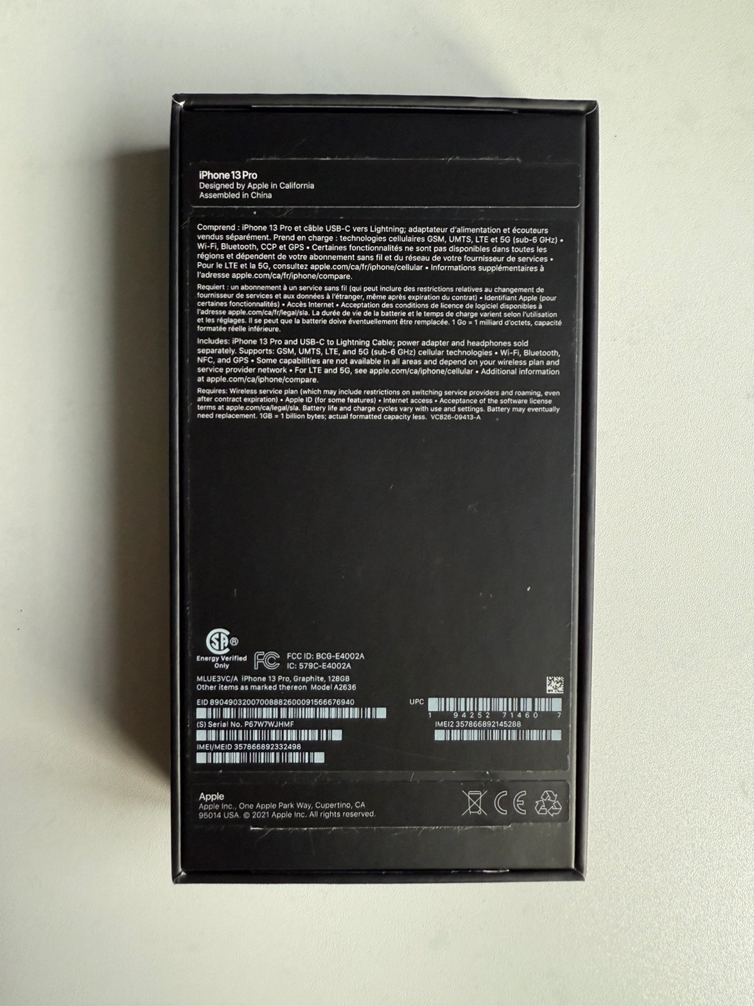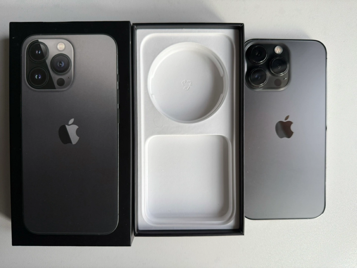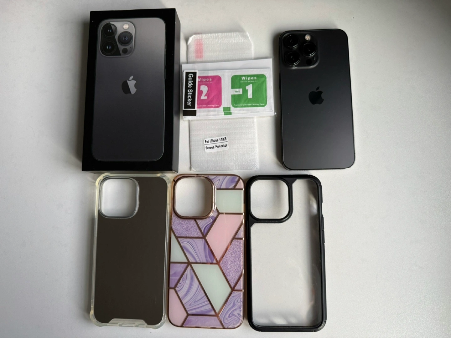 Used iPhone 13 Pro Max, Graphite, 128 GB, with a screen protector, 3 cases, and charging cable. Battery health is at 78%.