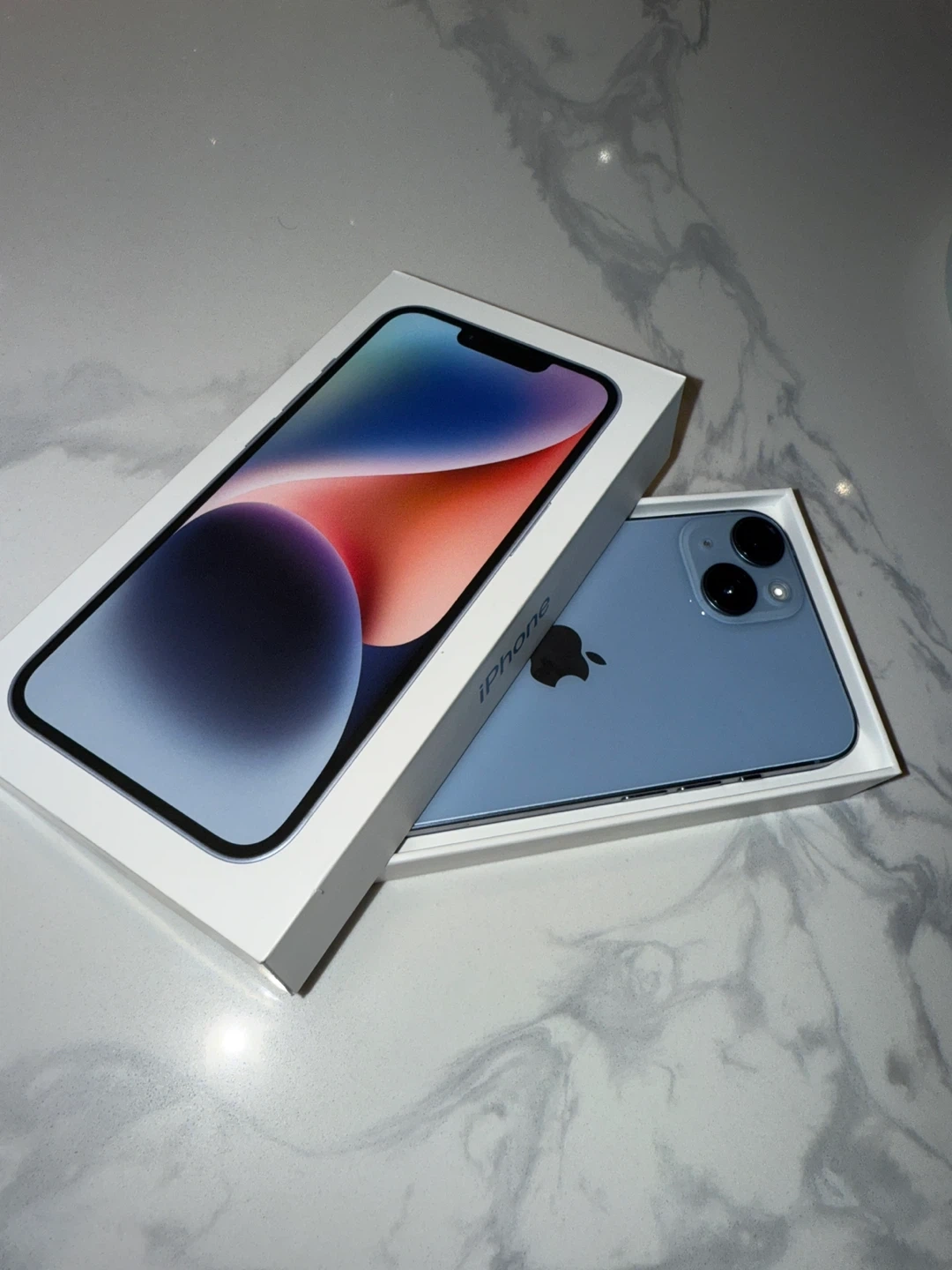 10Apple iphone 14, sky blue (box included) for sale. Starting at 750, willing to negotiate. Intact battery life, used for 10 months. No scratches or damages. Please reach out! - 86% battery life - 128 GB