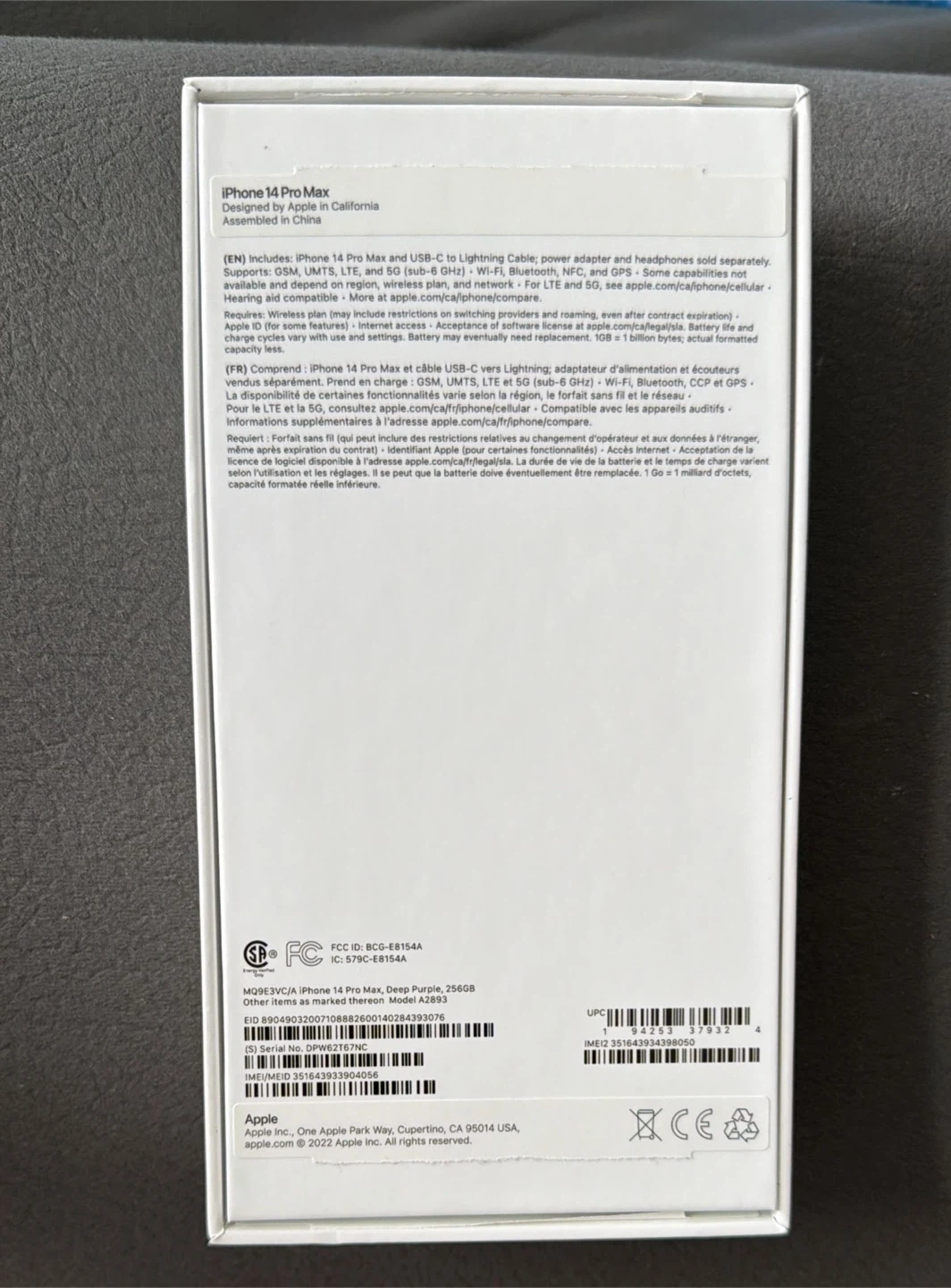 93Selling an iPhone 14 Pro Max in Deep Purple with 256GB of storage. It comes with its original box and included components like the USB-C to lightning cable and documentation. The phone is in great condition and ready for a new owner! Battery percentage 84%