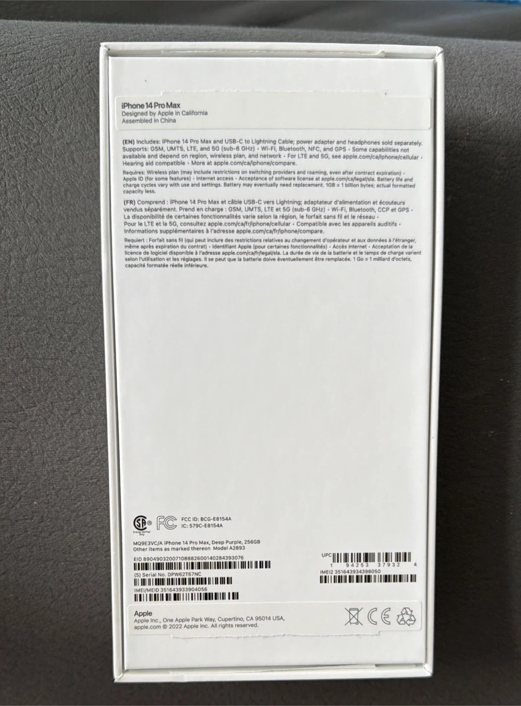 Selling my iPhone 14 Pro in purple! 256 GB. It's in great condition and comes with the original box and charging cable. Also included is a Spigen phone case! Battery percentage 84%