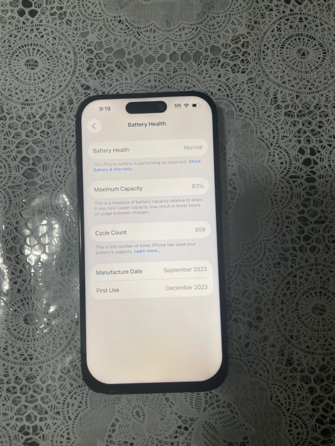 27Selling an iPhone 15 with 128GB of storage. The battery health is at 83%. It was first used in December 2023 and manufactured in September 2023