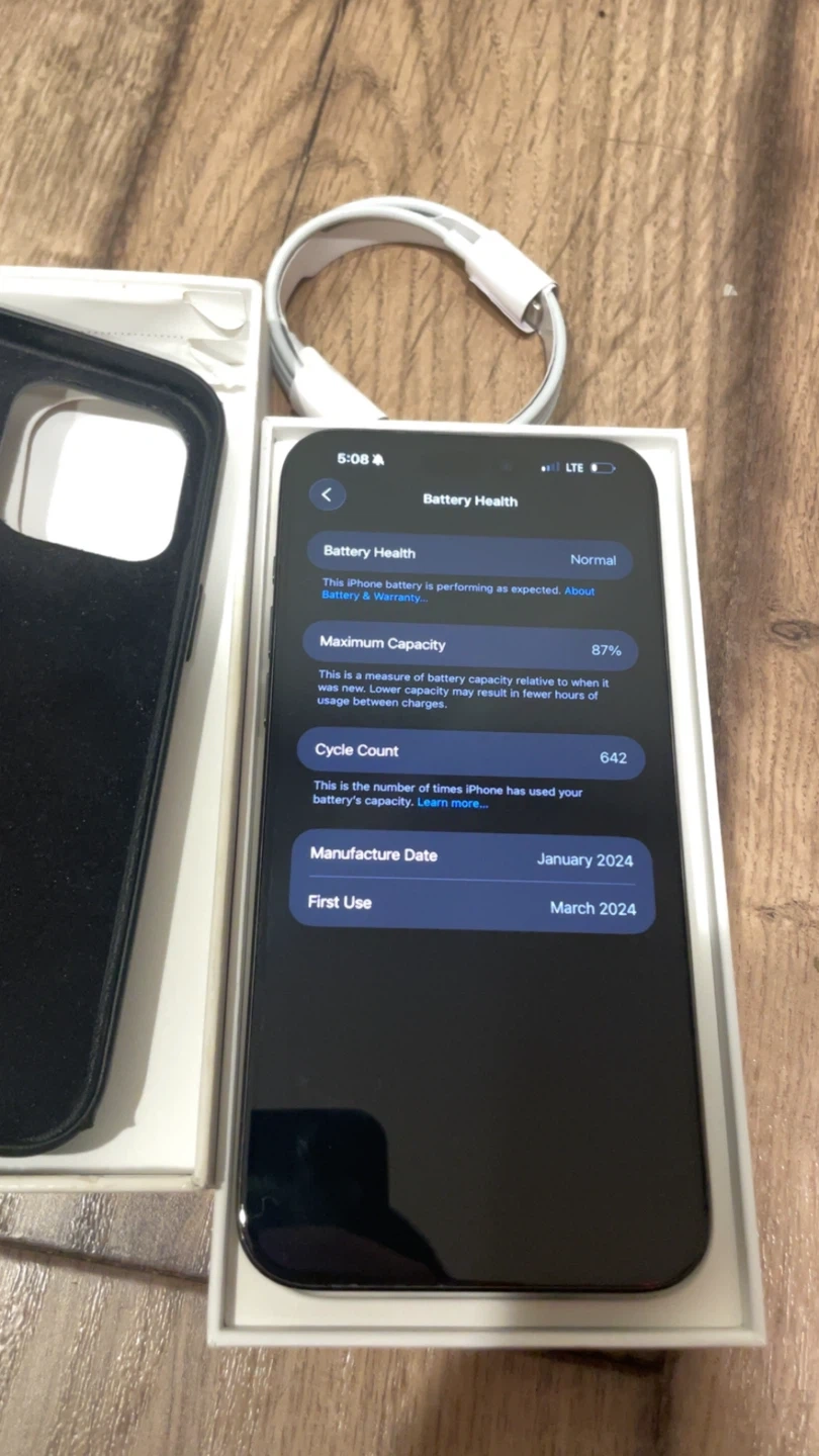 75(Send reasonable offer)Selling my iPhone 15 Pro Max with a spacious 512GB of storage! It's in excellent condition and comes with the box and charger. The battery health is at 87%. - Model Name: iPhone 15 Pro Max - Capacity: 512GB - Manufacture Date: January 2024