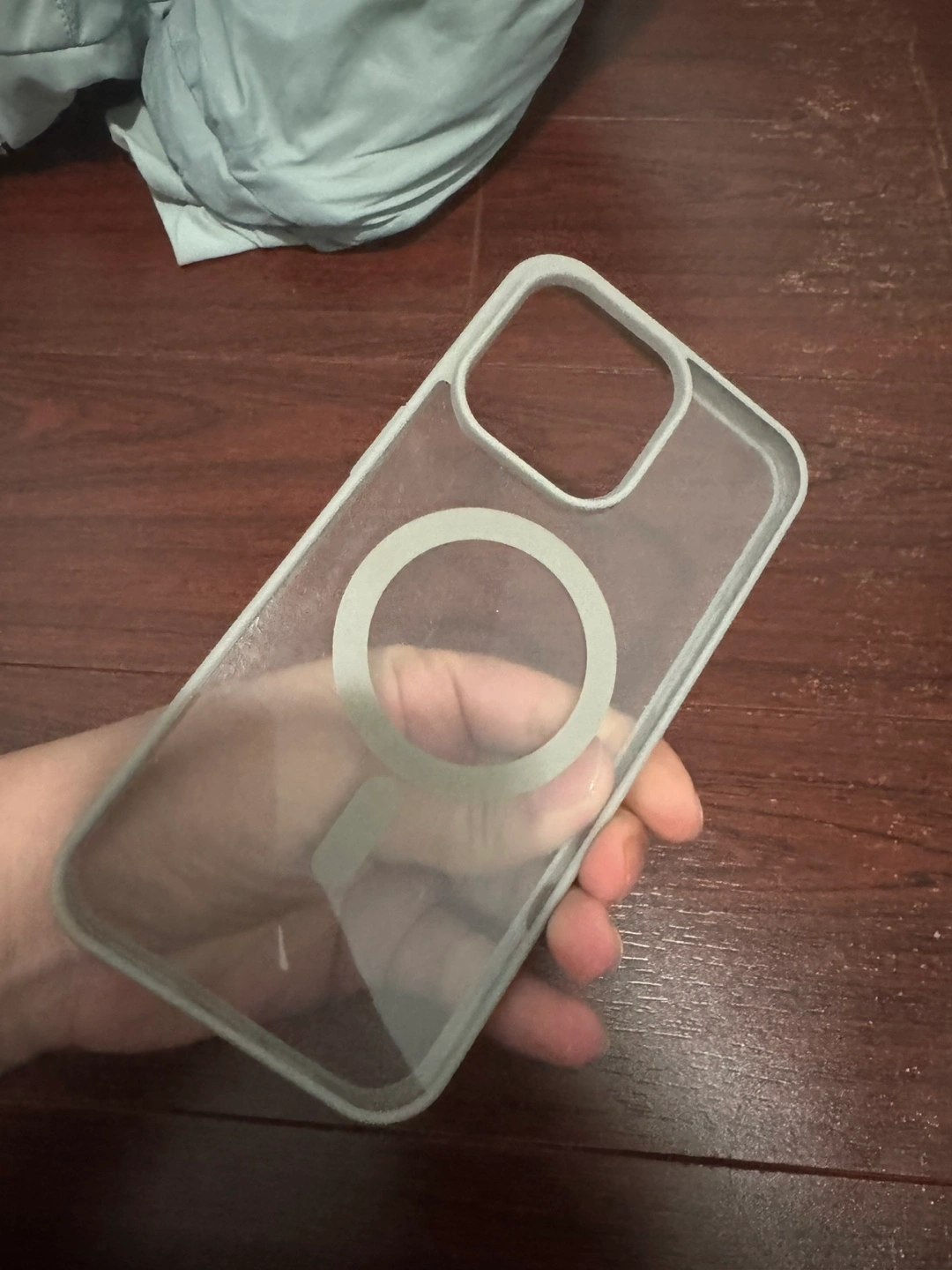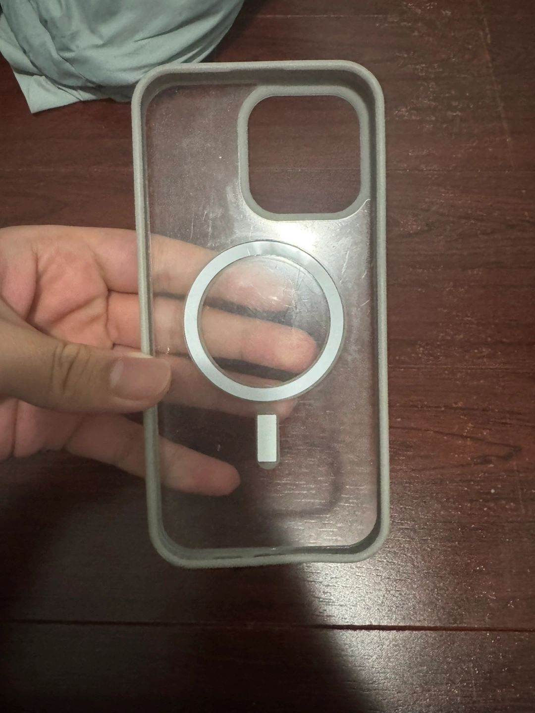 Clear phone case with a grey border. Compatible with MagSafe chargers. Designed for iPhone 12 or 13 models. Shows minor wear.