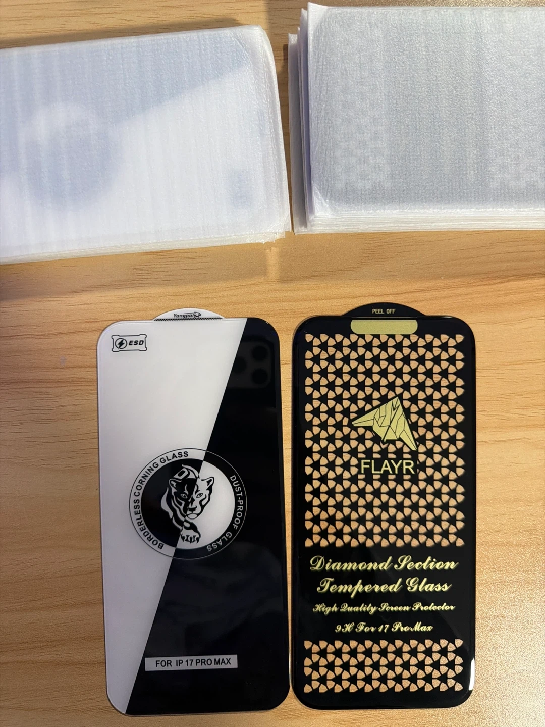 10Quantity - 15 Selling a FLAYR Diamond Section Tempered Glass screen protector for the IP 17 Pro Max. It's a high-quality screen protector with 9H hardness.