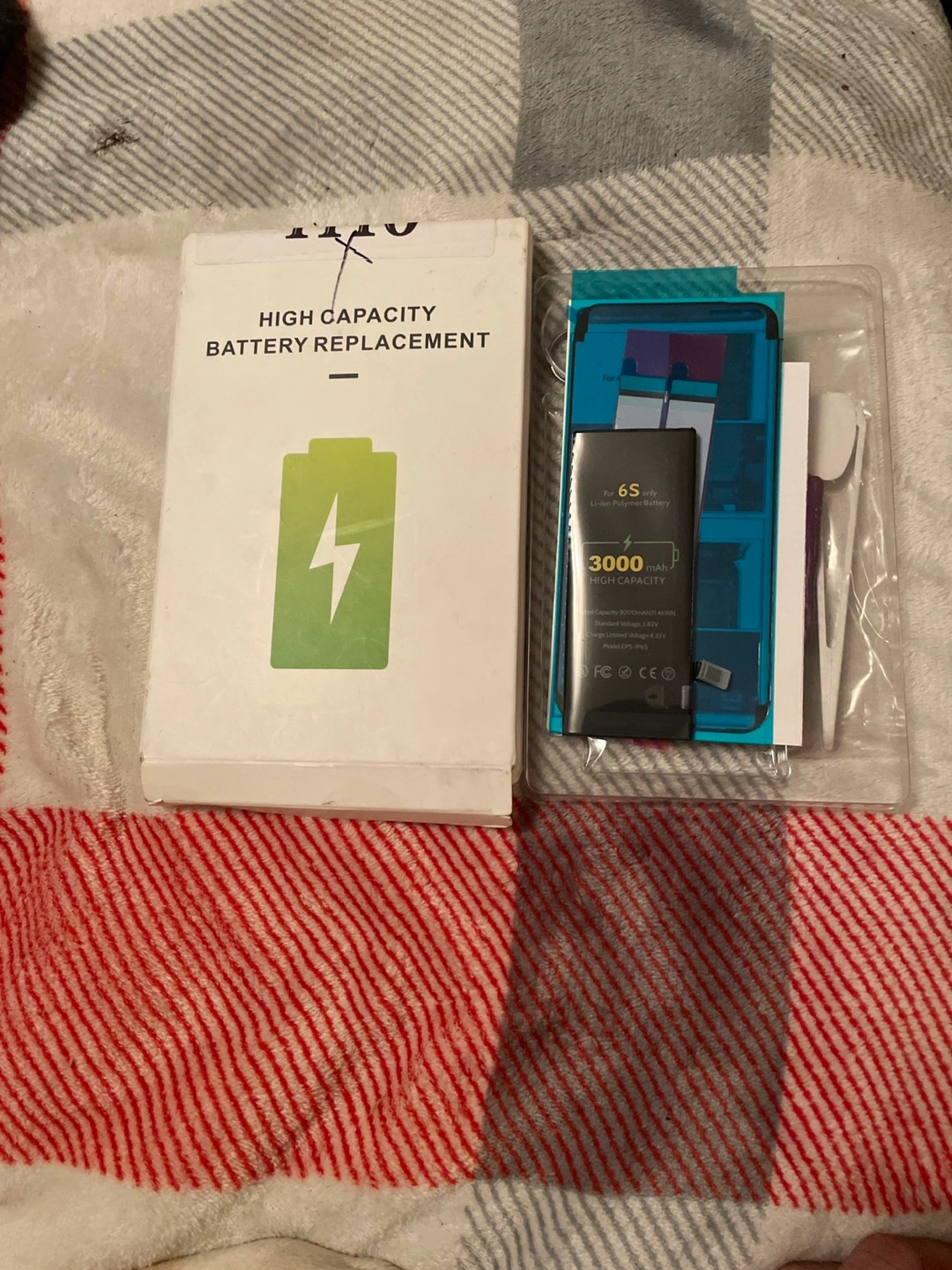 3000mAh battery replacement kit for iPhone 6S. Includes battery, adhesive strips, and tools. High-capacity replacement. New, unopened.
