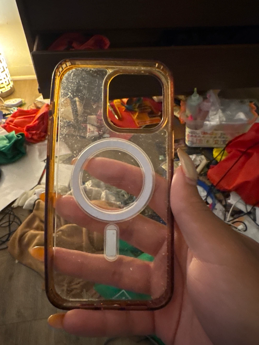100Selling a used iPhone case with MagSafe compatibility. It has a clear back and a brown border. Shows signs of wear.