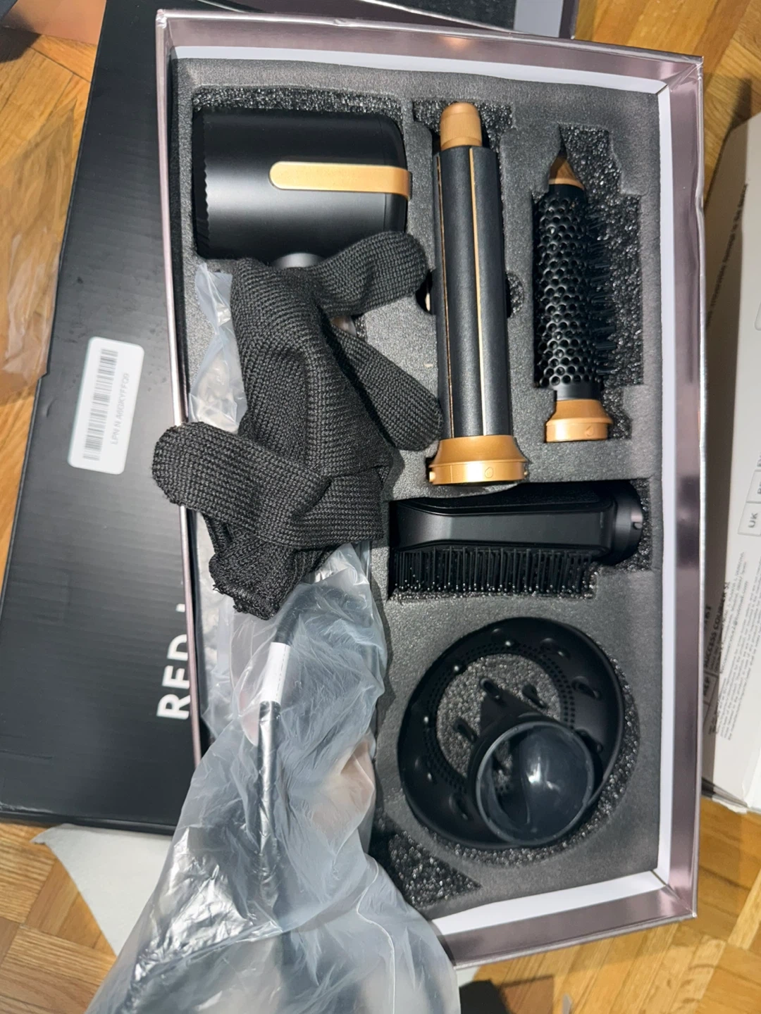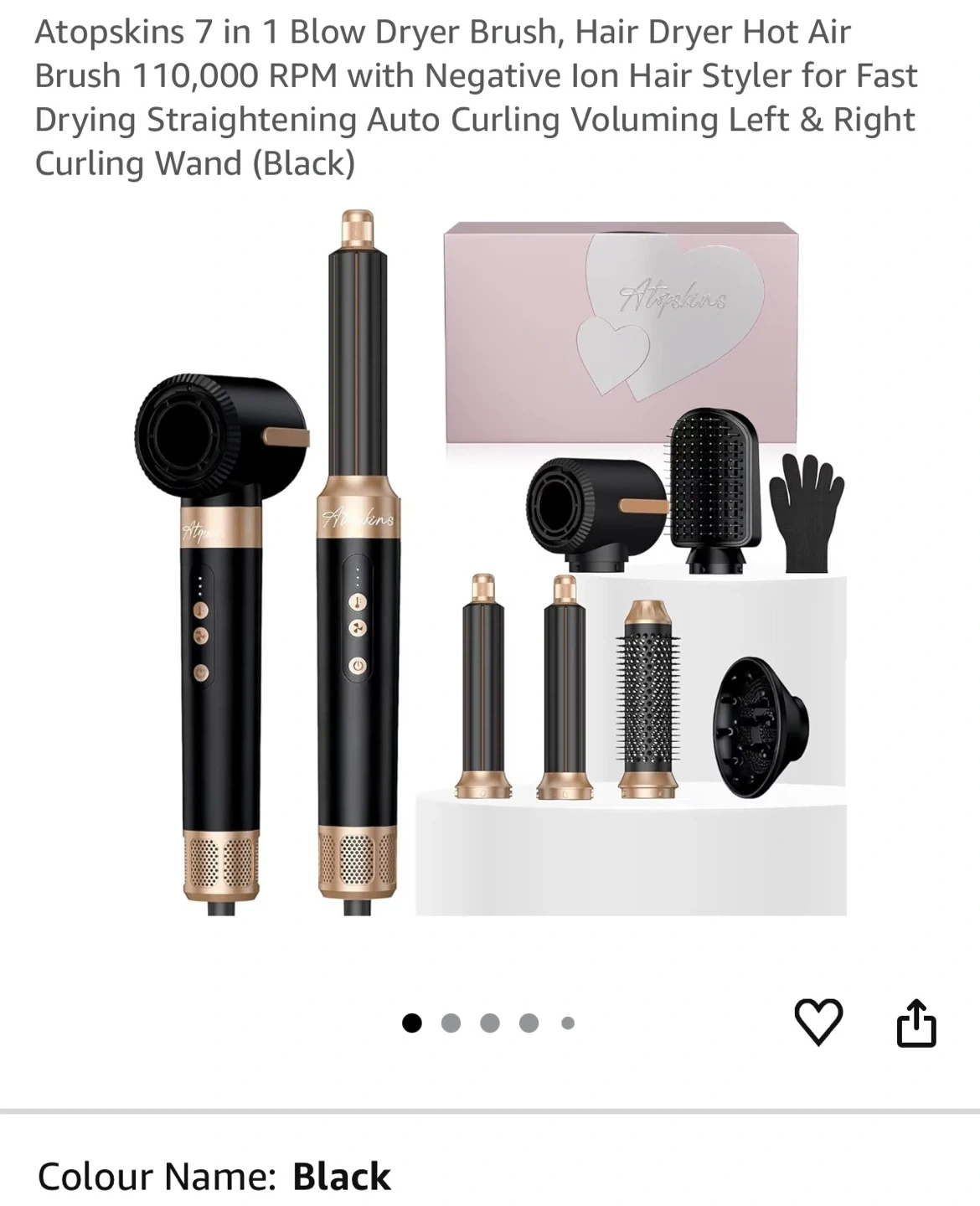 This Atopskins hair styler comes in black with gold accents. It's a 7-in-1 set with multiple attachments for drying, straightening, and curling. Includes a heat-resistant glove. Great for various hair styling needs!
