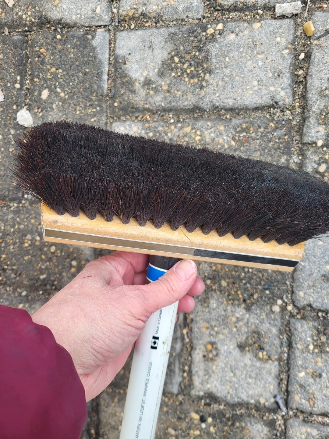 This is a Curlmaster curling broom, made in Canada. It's a curling broom with a wooden head and black bristles. The handle is white with blue and green accents. Perfect for sweeping on the ice!