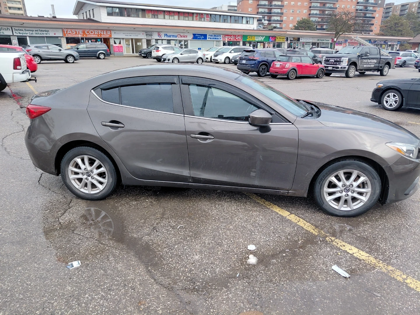 This is a metalic brown Mazda 3 sedan. It's a four-door car with tinted windows. The car has alloy wheels and a rear spoiler. It's a dependable ride for daily commuting.