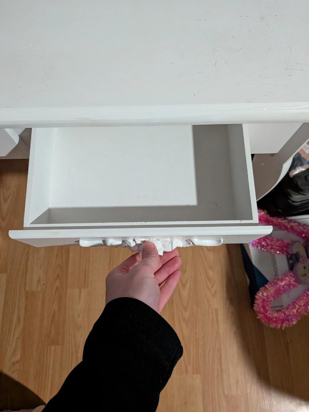 A classic white vanity desk with an oval mirror. It features several drawers for storage, including two larger ones at the front with decorative rose carvings. The top surface has two smaller compartments with ornate handles. It's perfect for a bedroom or dressing area.