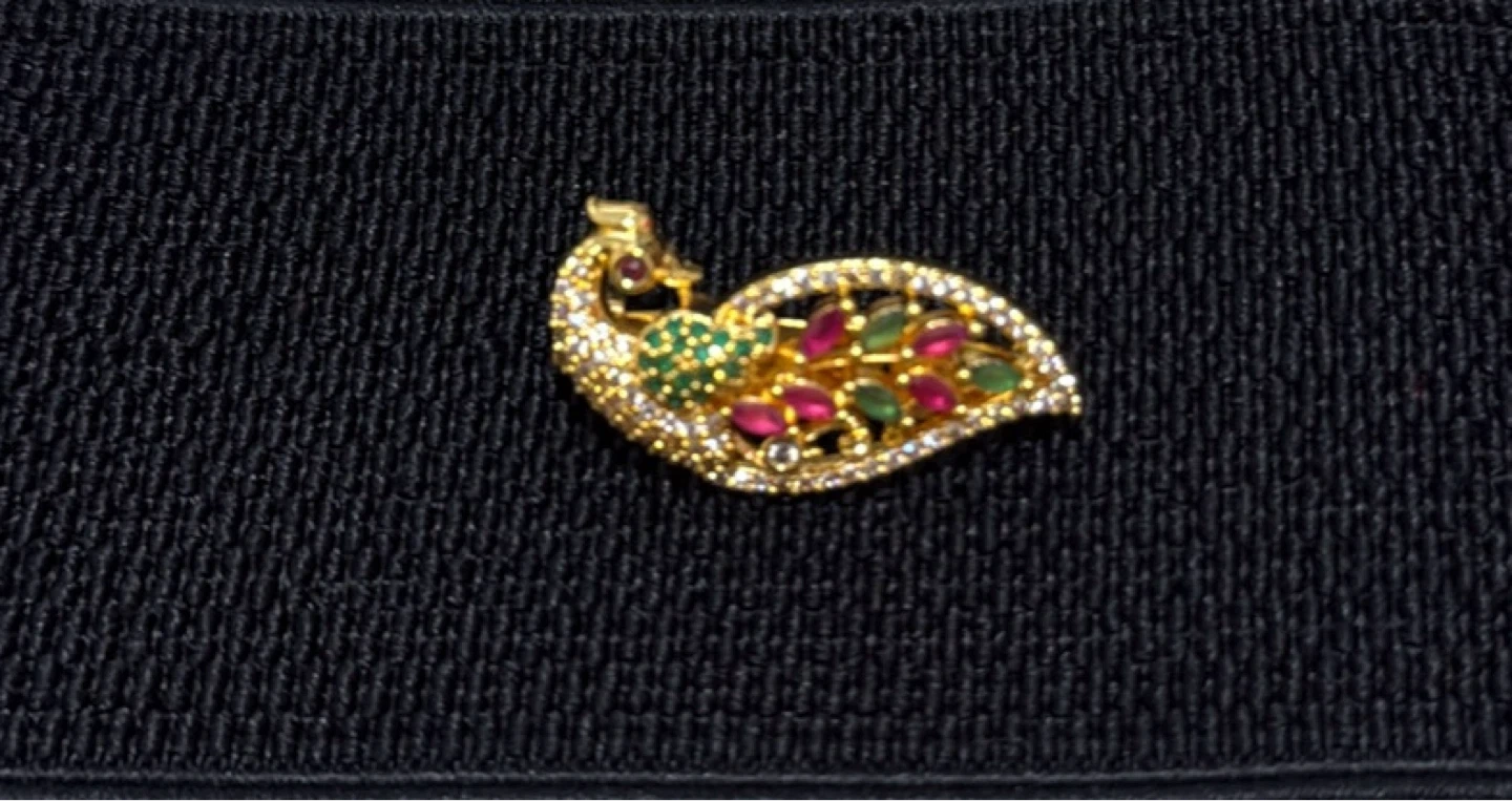 This beautiful saree/dress pin features a peacock design, accented with colourful ruby and emerald stones and sparkling white stones. It's crafted with a gold-tone finish. It's perfect for adding a touch of elegance to any outfit.