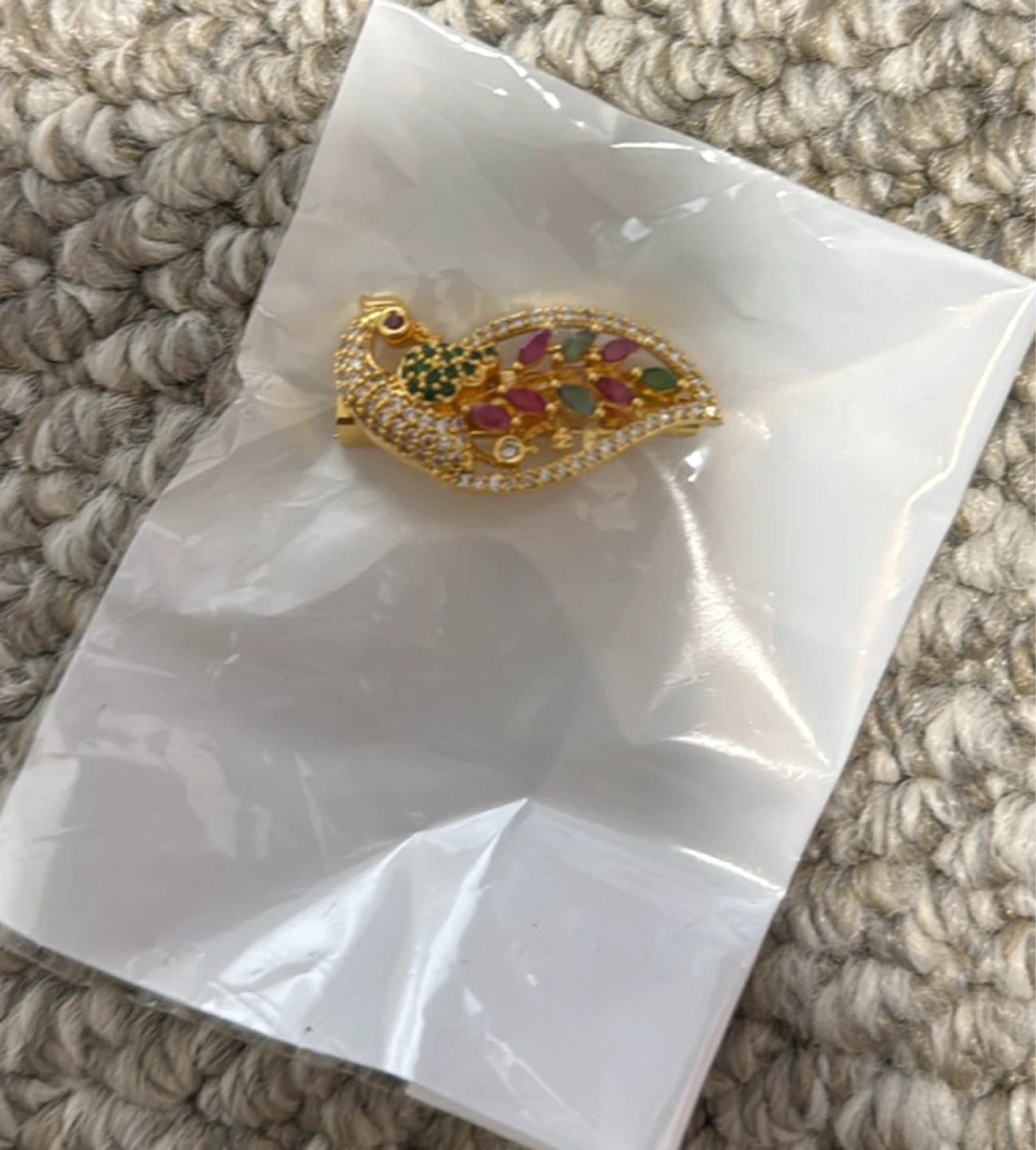 This beautiful saree/dress pin features a peacock design, accented with colourful ruby and emerald stones and sparkling white stones. It's crafted with a gold-tone finish. It's perfect for adding a touch of elegance to any outfit.