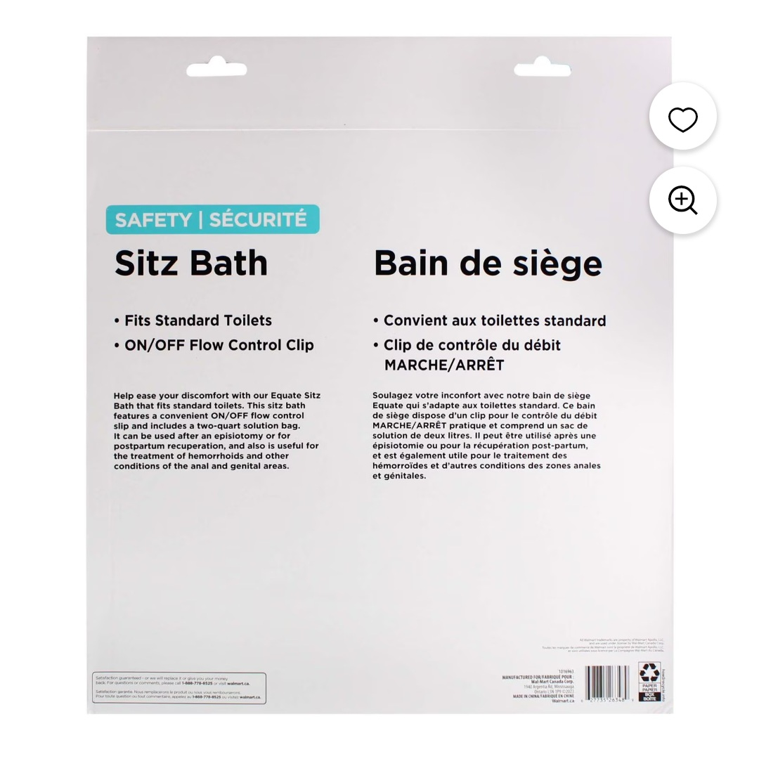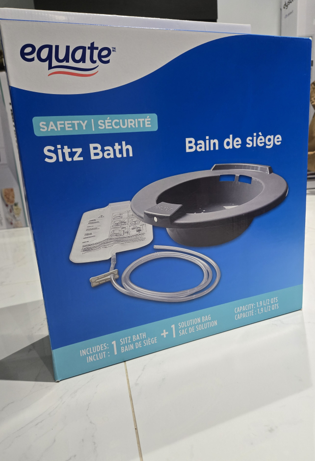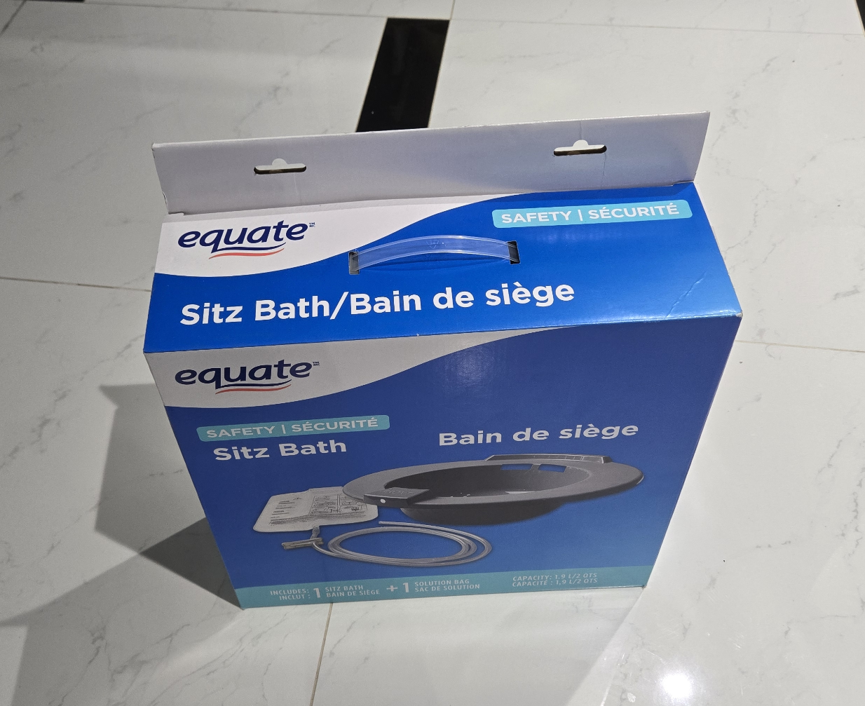 I'm selling an Equate Sitz Bath, designed to fit standard toilets. It features an ON/OFF flow control clip for your convenience. It can be used after an episiotomy or for postpartum recovery, and is also useful for the treatment of hemorrhoids and other conditions of the anal and genital areas. It includes one sitz bath and one solution bag, with a capacity of 1.9 L / 2 QTS