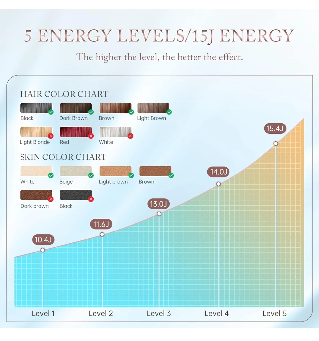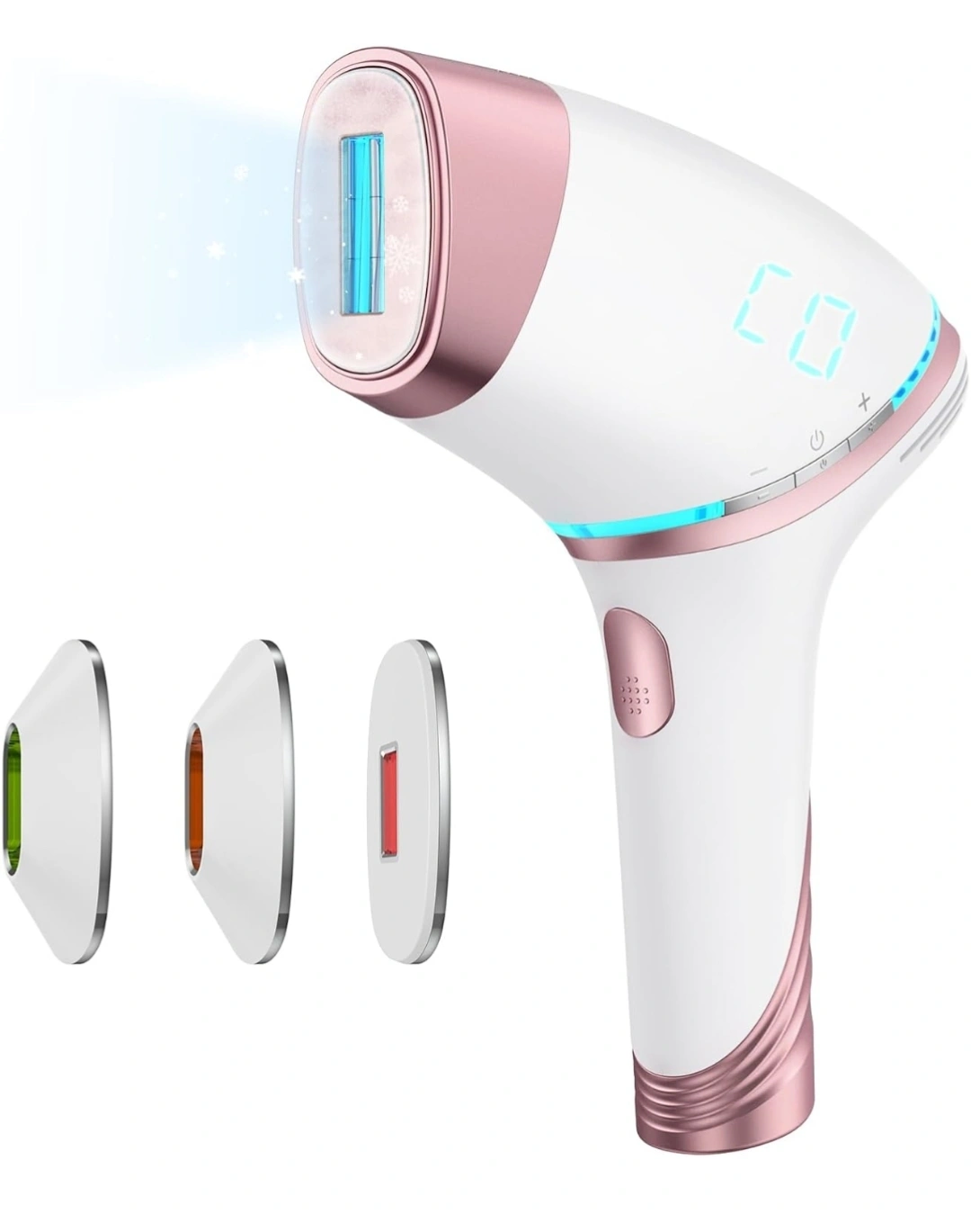 Handheld IPL hair removal device. Features five energy levels and three interchangeable treatment heads for different body areas. Auto and manual modes available. Effective hair reduction. Rose gold and white design.