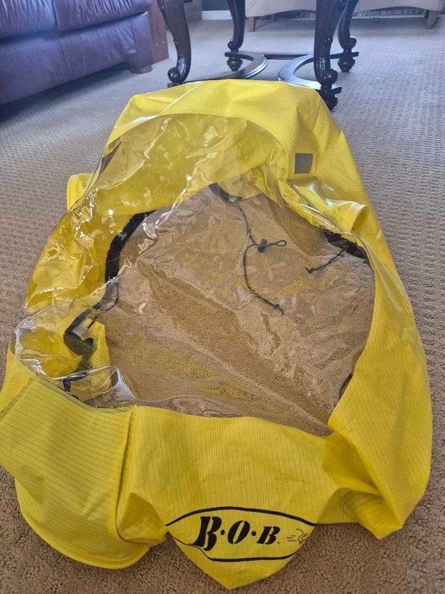 This bright yellow Bob jogging stroller rain cover has reflective stripes for good visibility day or night.