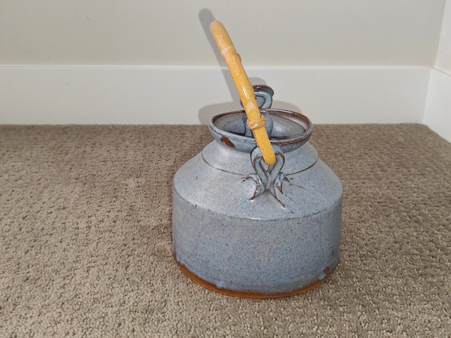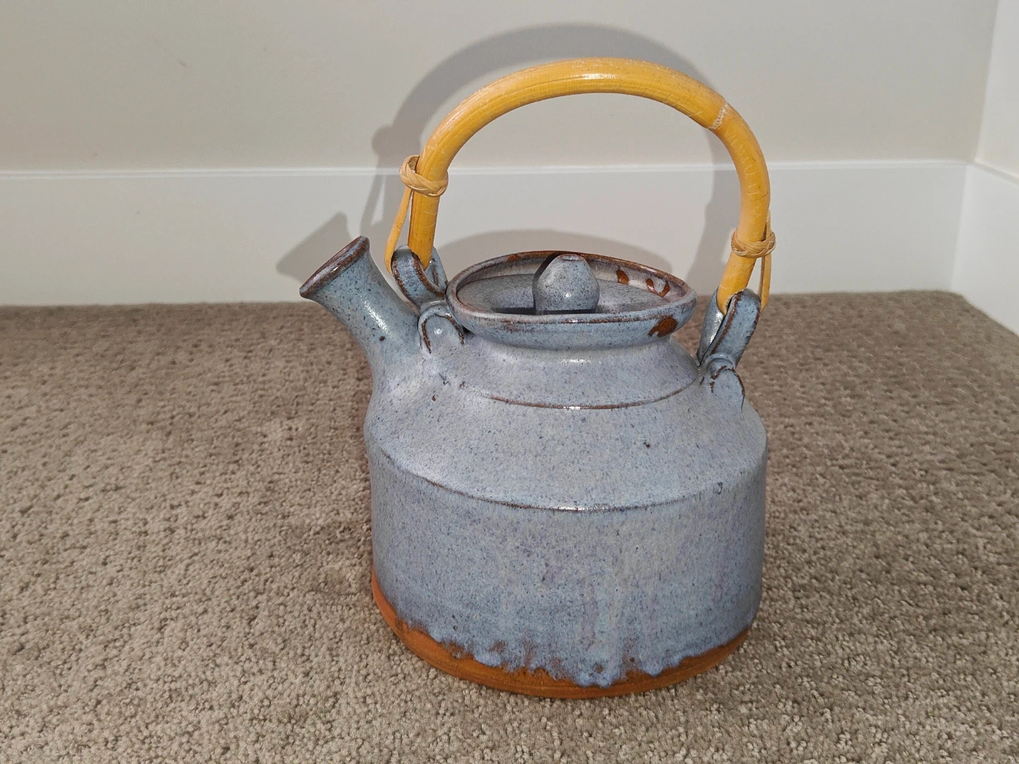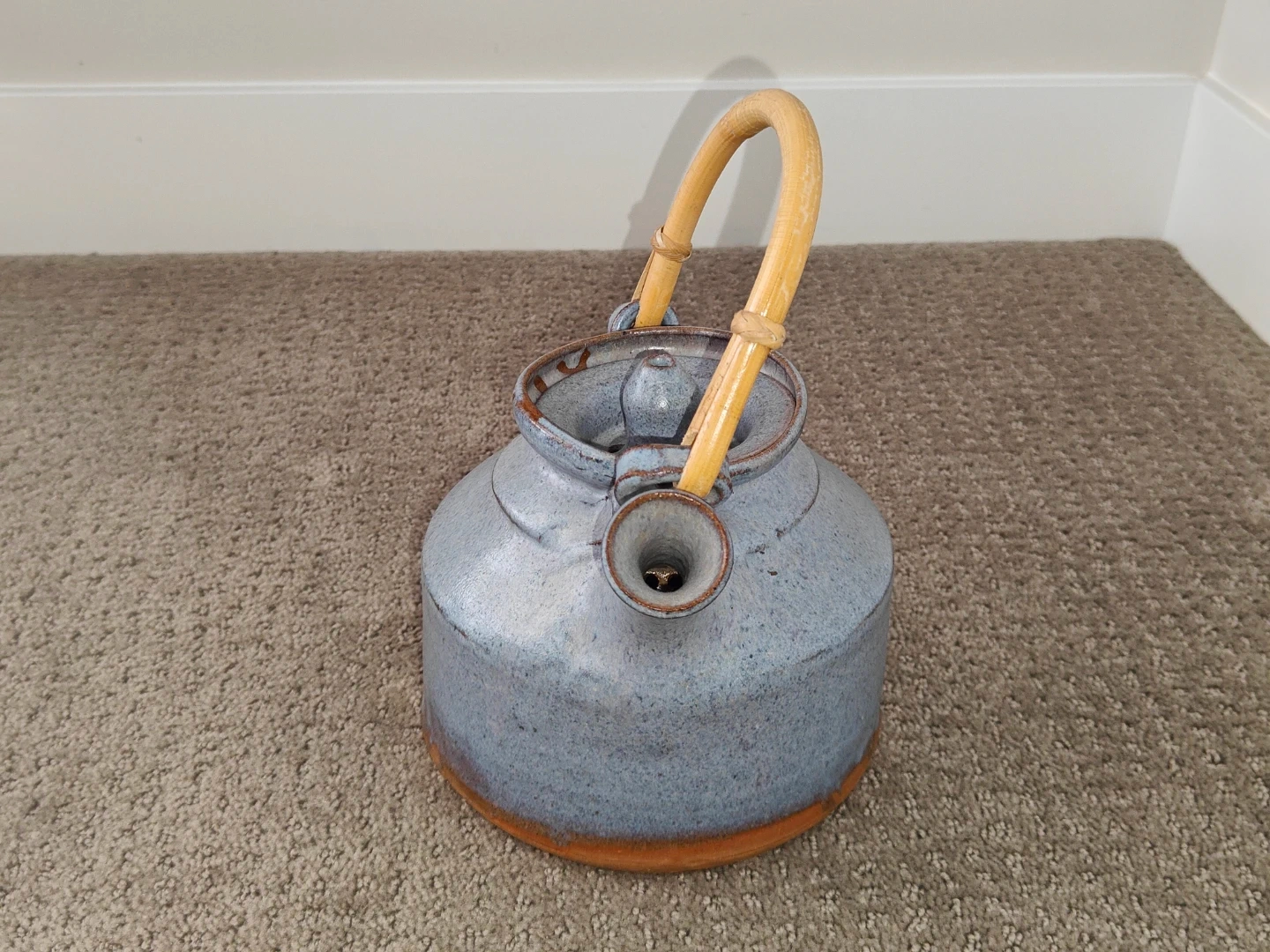 I am selling a Vintage Rare Blue Pottery Art Tea Pot Signed with Lid and Wood Handle in excellent condition. Enhance your tea ritual or pottery collection with this exquisite, hand-thrown stoneware teapot. This piece features a striking blue-grey speckled glaze with warm, earthy iron-oxide transitions at the base and rim. It is perfectly balanced with a traditional bent bamboo handle and a precision-fitted lid.