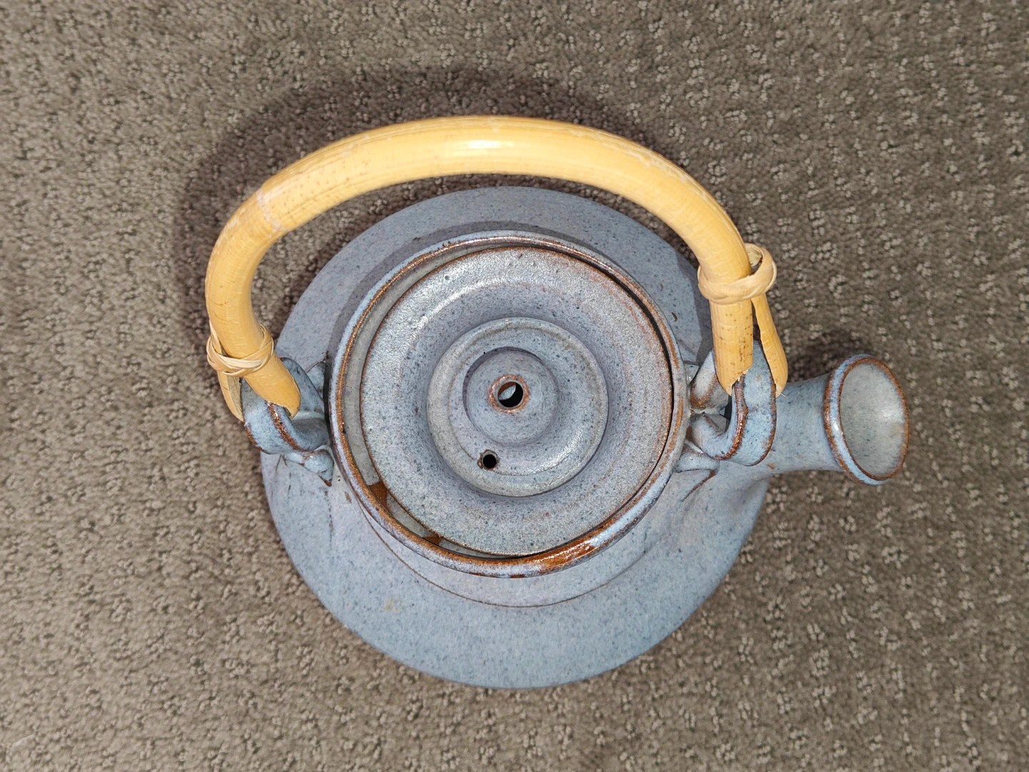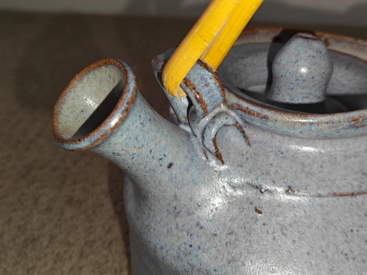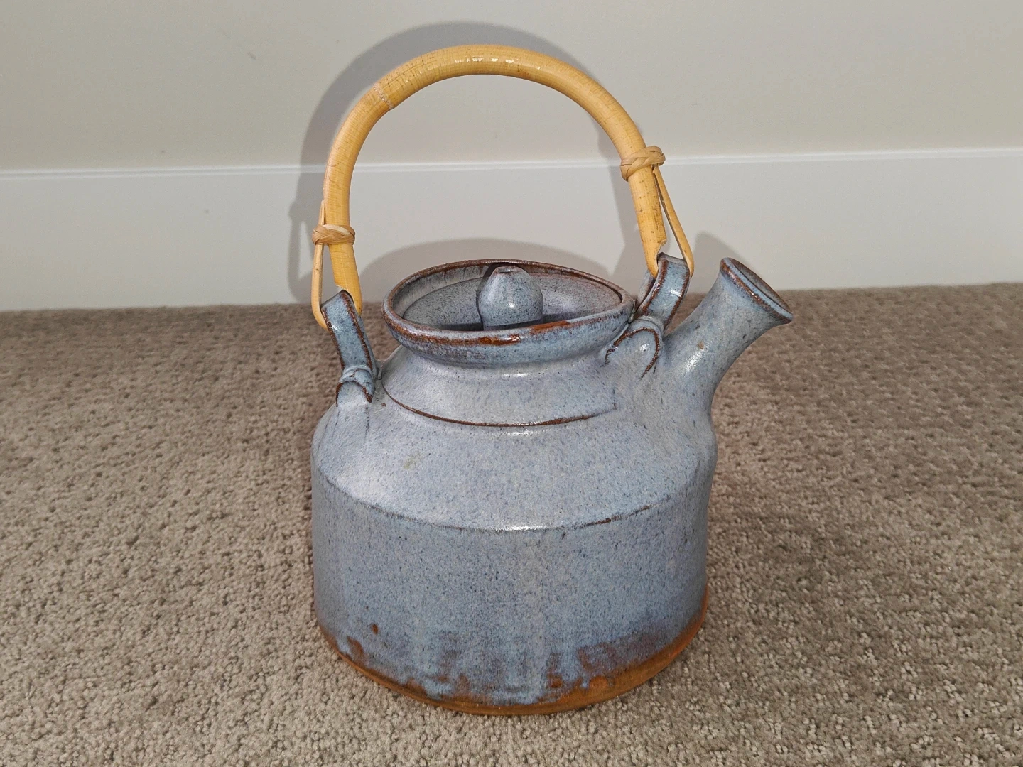 I am selling a Vintage Rare Blue Pottery Art Tea Pot Signed with Lid and Wood Handle in excellent condition. Enhance your tea ritual or pottery collection with this exquisite, hand-thrown stoneware teapot. This piece features a striking blue-grey speckled glaze with warm, earthy iron-oxide transitions at the base and rim. It is perfectly balanced with a traditional bent bamboo handle and a precision-fitted lid.