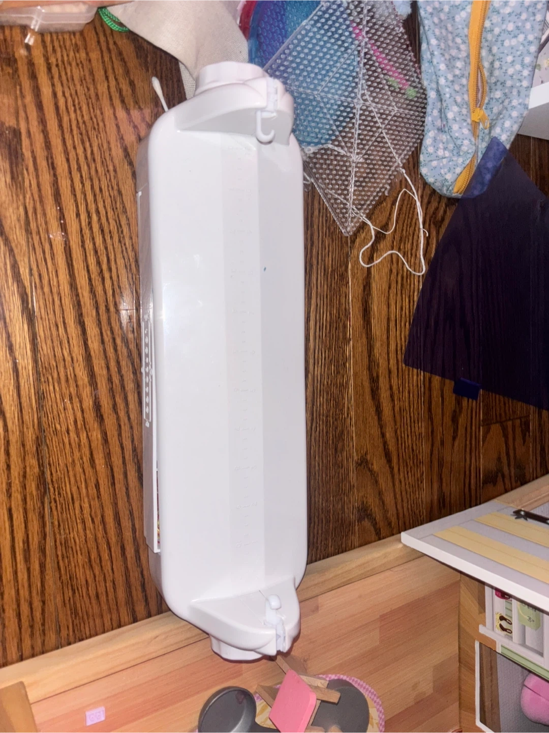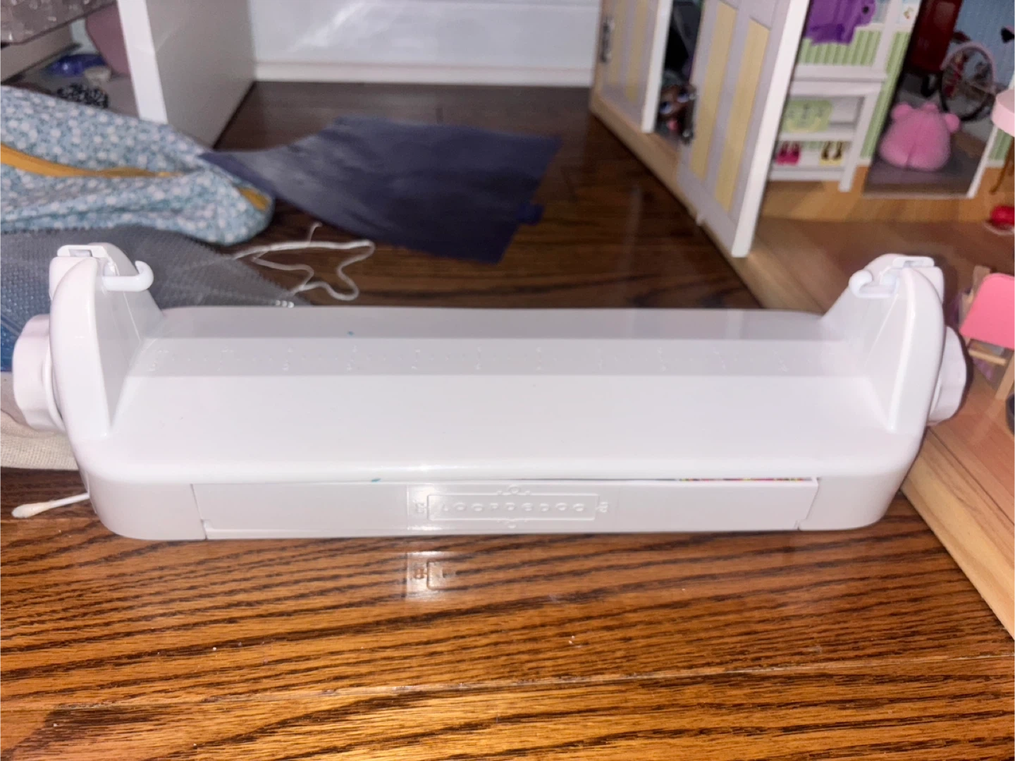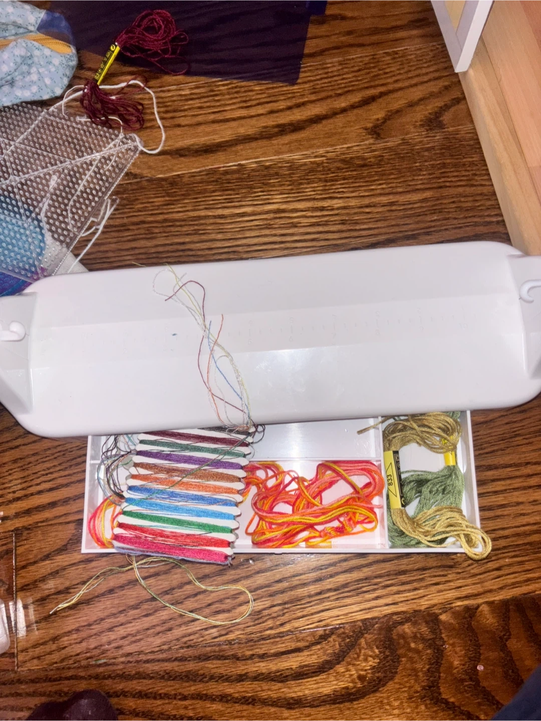 This white plastic thread winder comes with various colours of embroidery floss. It includes multiple compartments to keep your threads organized. Perfect for crafts and DIY projects!