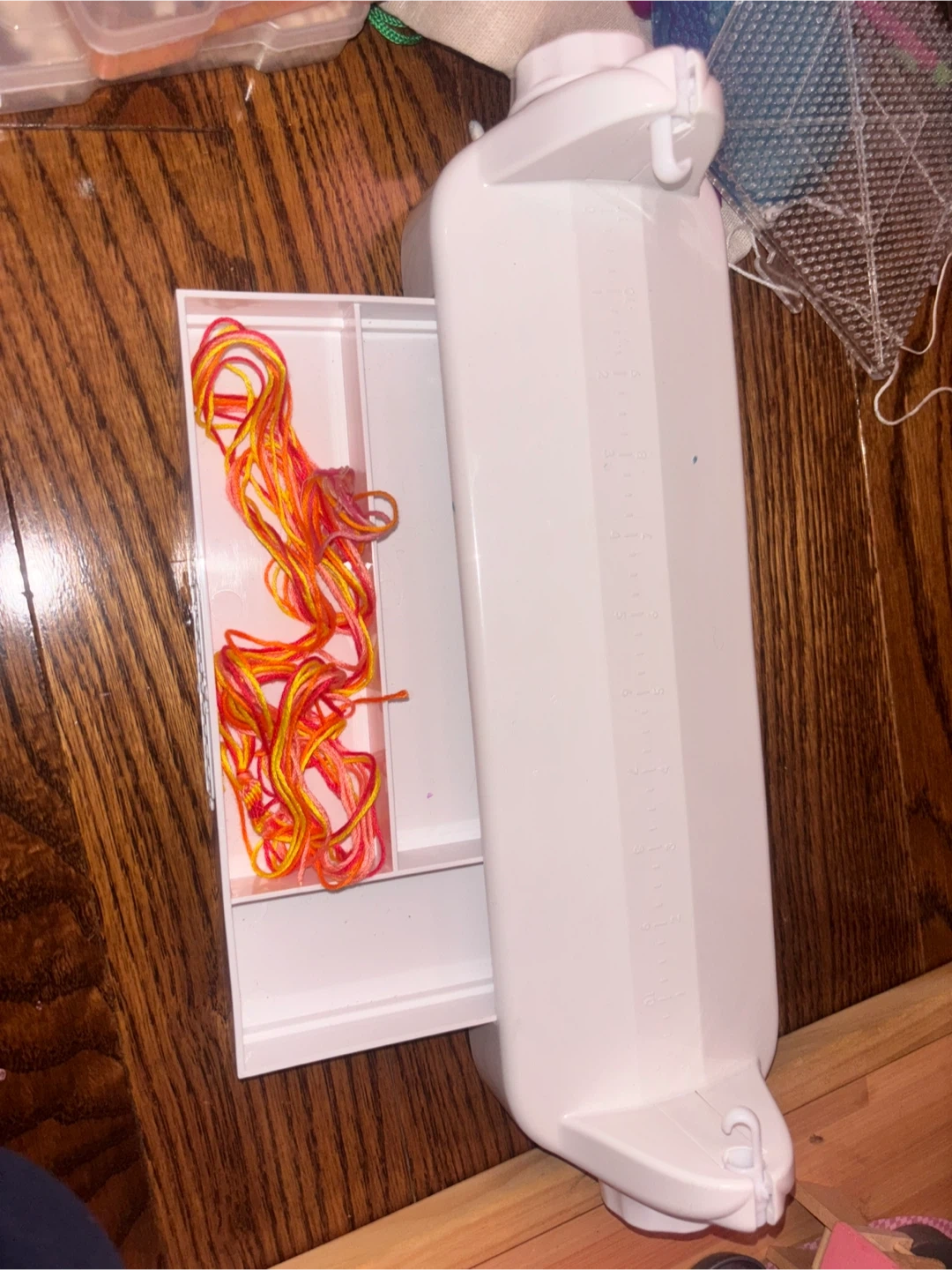 This white plastic thread winder comes with various colours of embroidery floss. It includes multiple compartments to keep your threads organized. Perfect for crafts and DIY projects!