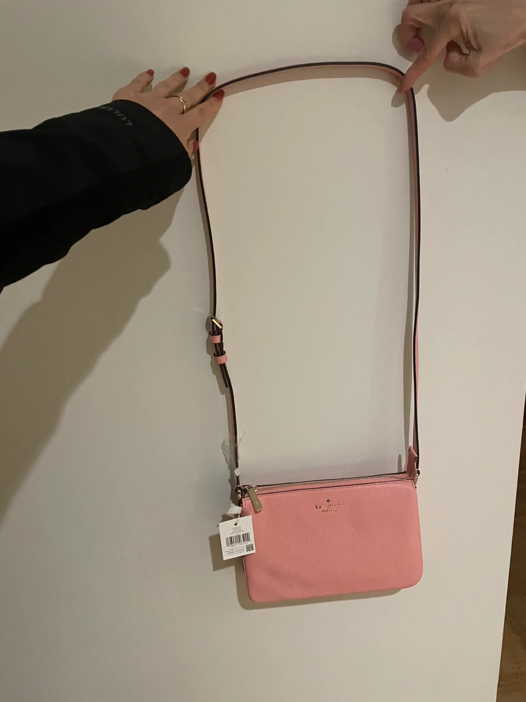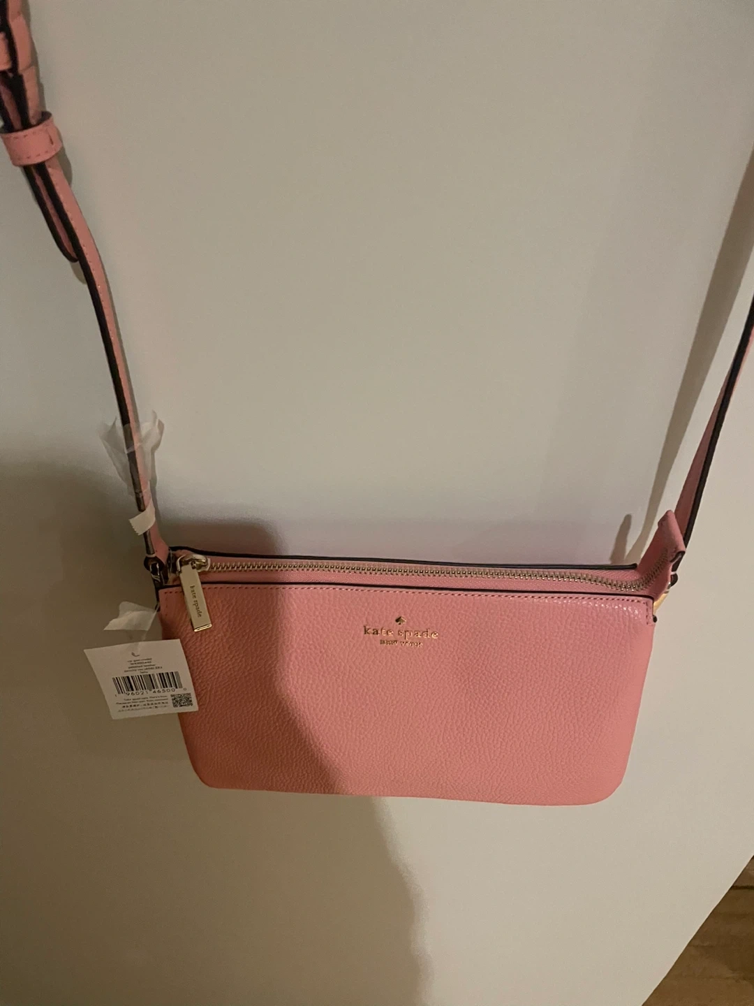 A pink Kate Spade crossbody bag made of pebbled leather. It features a zip closure and an adjustable strap. This bag is perfect for carrying your essentials on the go!