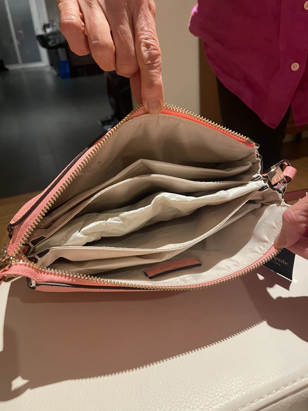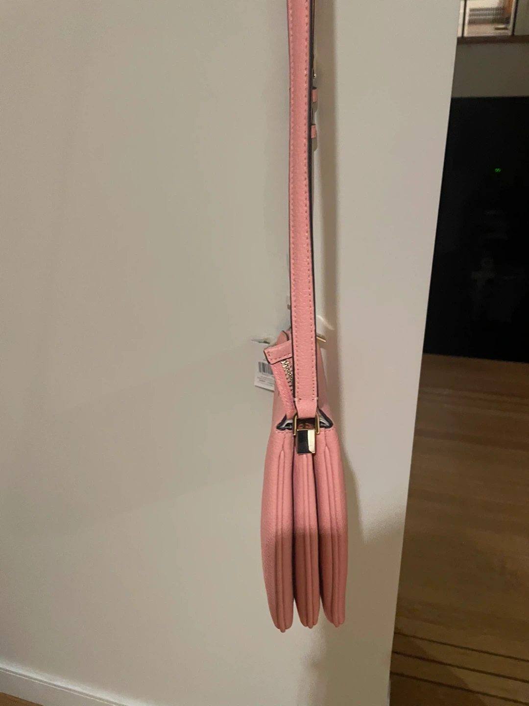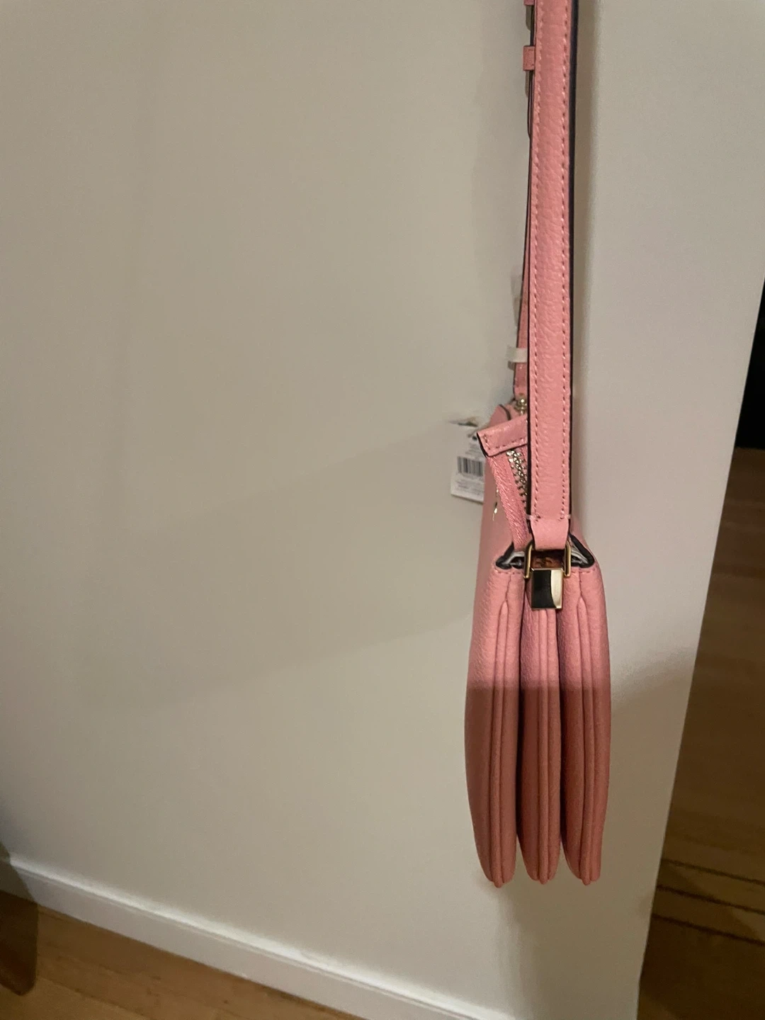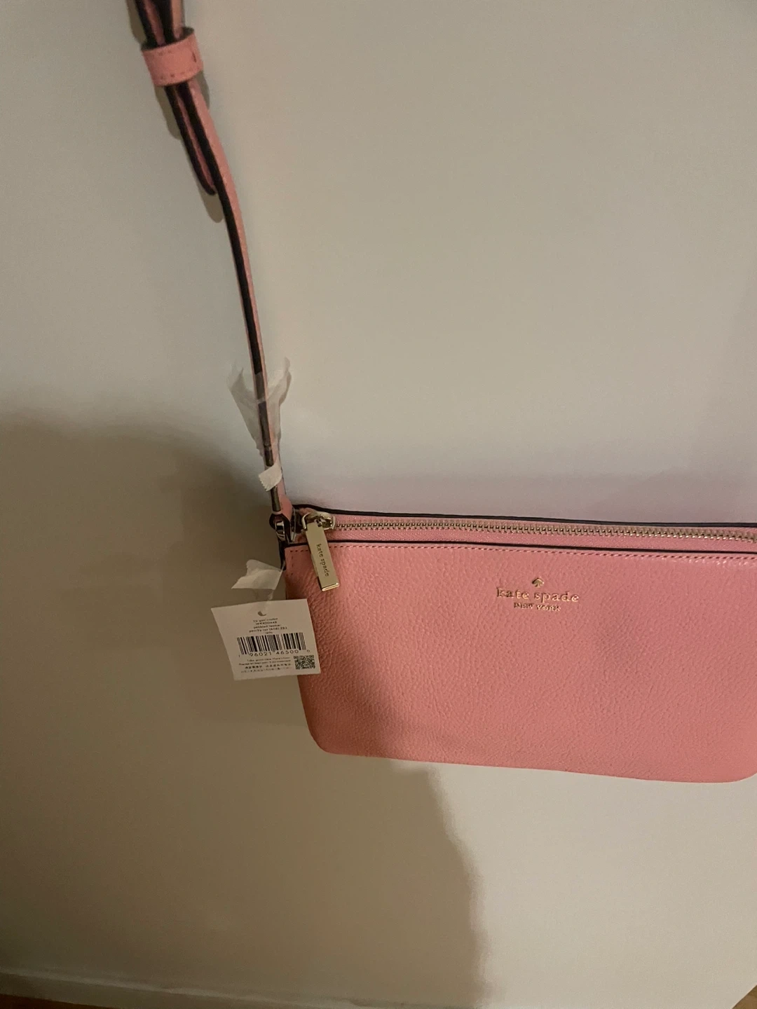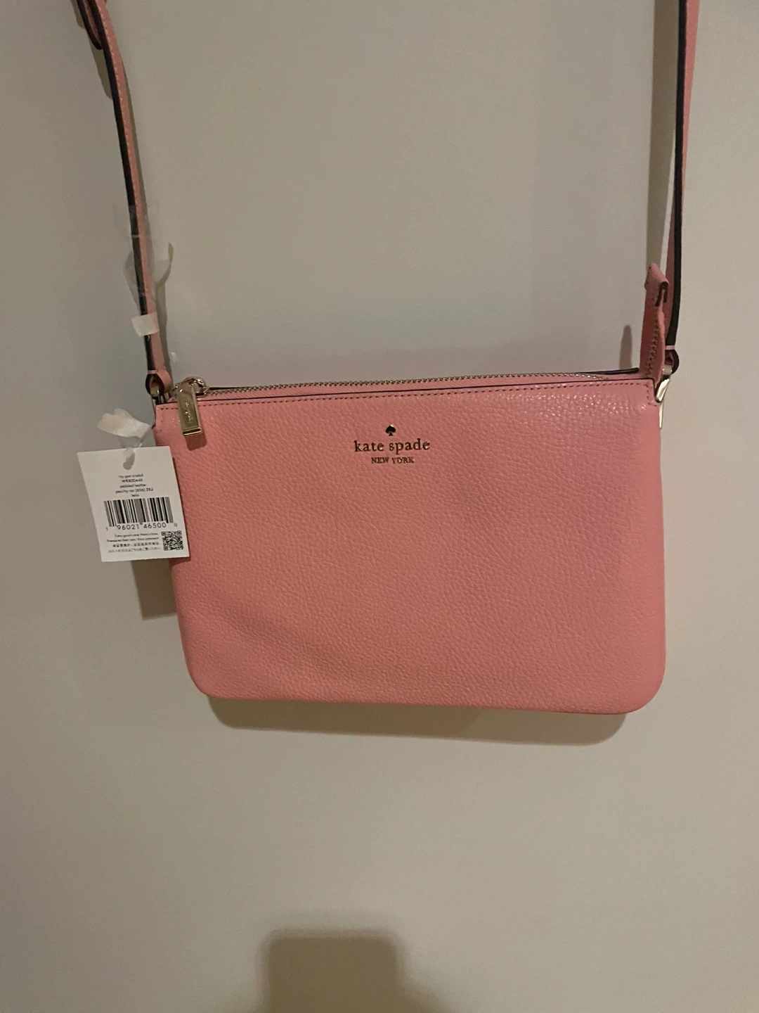 A pink Kate Spade crossbody bag made of pebbled leather. It features a zip closure and an adjustable strap. This bag is perfect for carrying your essentials on the go!