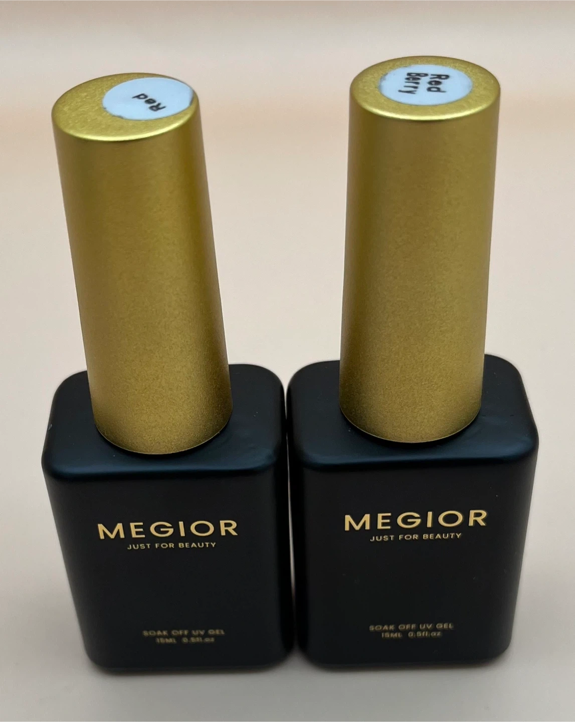 Selling two bottles of Megior soak off UV gel nail polish. One is in the colour Red, and the other is Red Berry! Both bottles contain 15mL / 0.5fl.oz of product