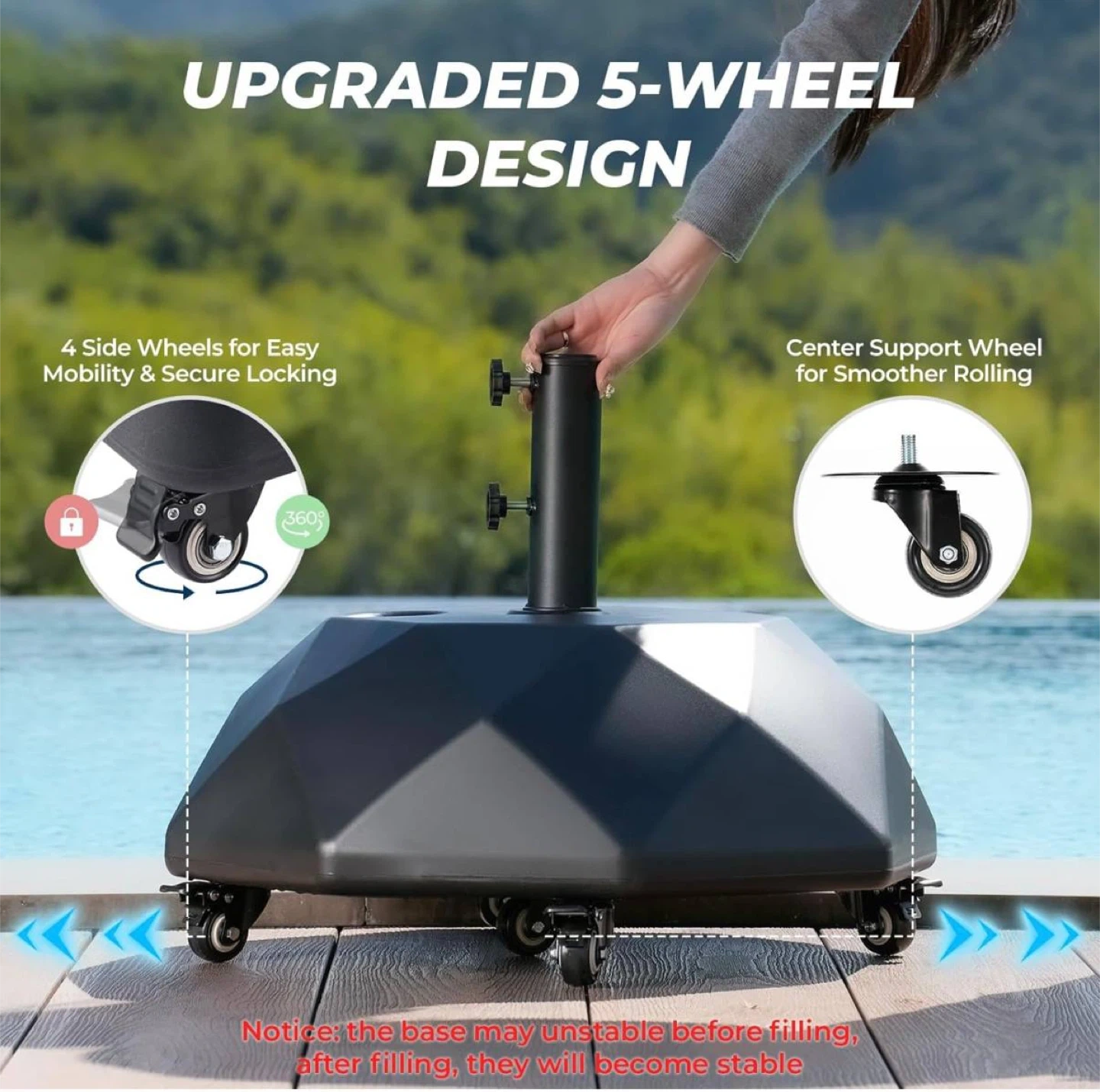Make your outdoor setup stable and effortless with this premium HOMSHADE umbrella base. Designed for heavy-duty support and easy mobility, it’s perfect for patios, decks, and backyard spaces. Fill it, roll it, and enjoy a secure umbrella even on windy days.