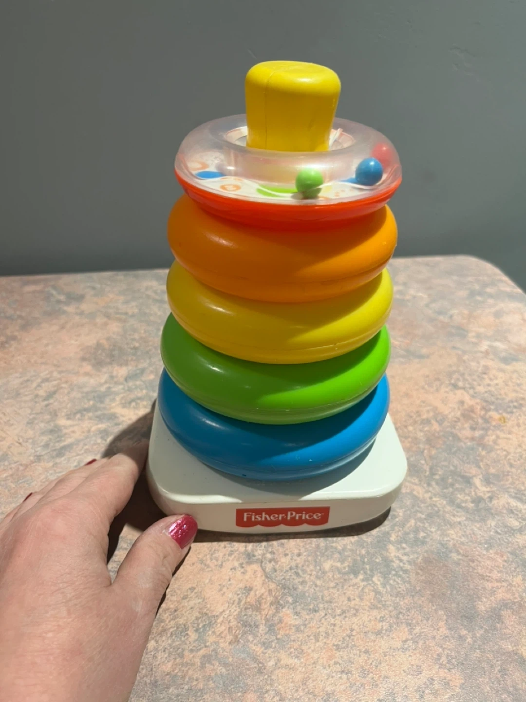 This Fisher-Price ring stacker toy features colourful rings on a base. It's made of plastic. Great for babies learning to stack!