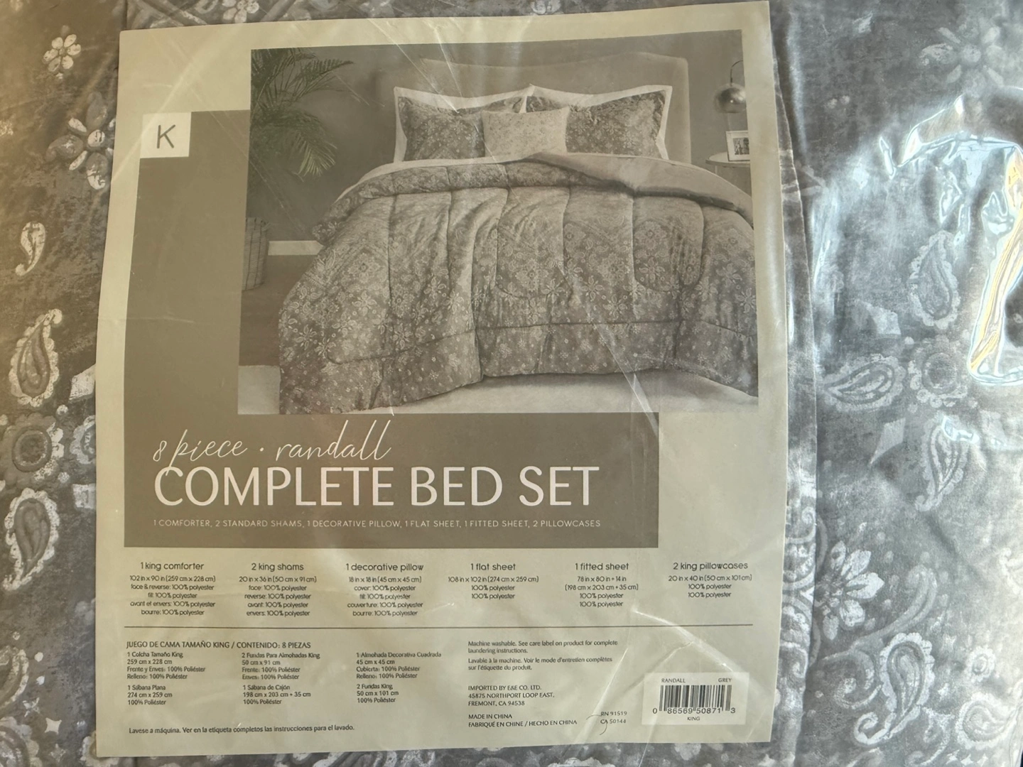 Grey paisley print. Includes comforter, two shams, decorative pillow, flat sheet, fitted sheet, and two pillowcases. Machine washable.
