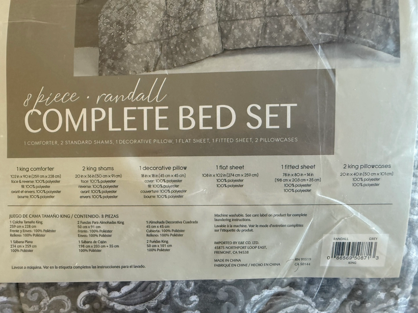 Grey paisley print. Includes comforter, two shams, decorative pillow, flat sheet, fitted sheet, and two pillowcases. Machine washable.