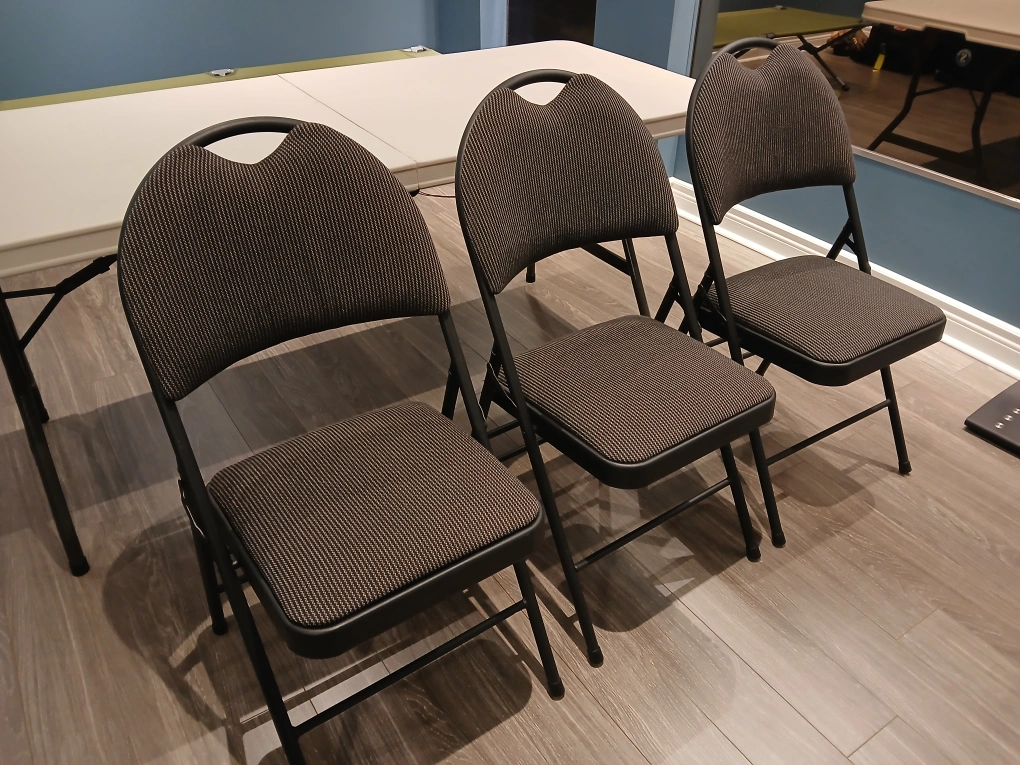 Selling a set of three folding chairs! They're in great shape and perfect for extra seating when you have guests over or for any event where you need portable chairs. The chairs have a dark gray patterned fabric on the seat and back, with a black metal frame. Easy to store and set up