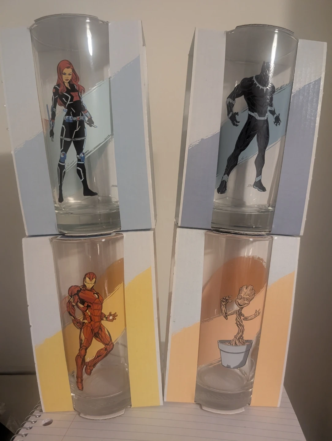 Selling a set of four Marvel character glasses. Each glass features a different character: Black Widow, Black Panther, Iron Man, and Groot. They are in their original boxes!