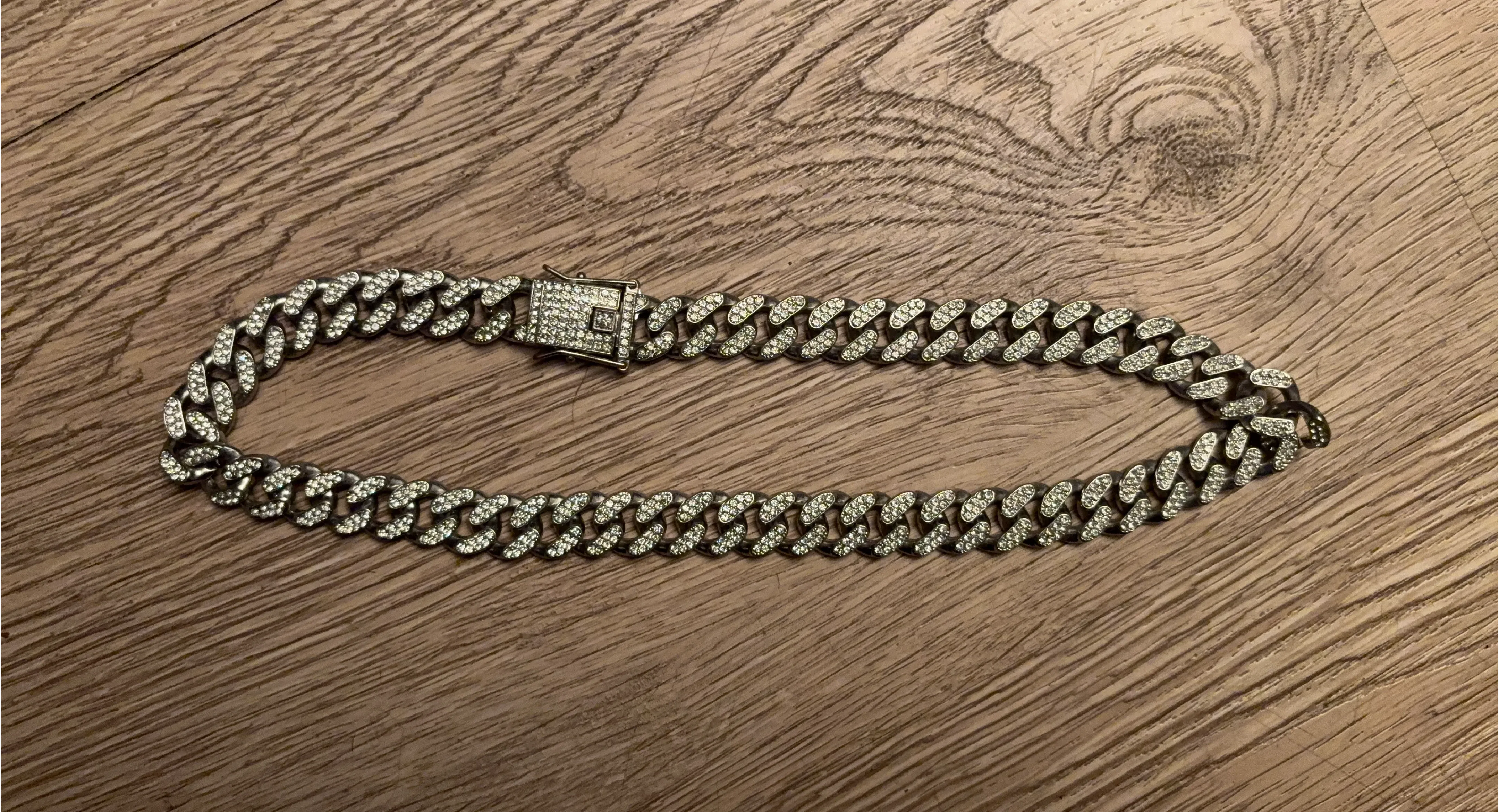 Sparkly Cuban link chain necklace. Features a secure clasp closure encrusted with rhinestones. Adds a nice touch of shine!