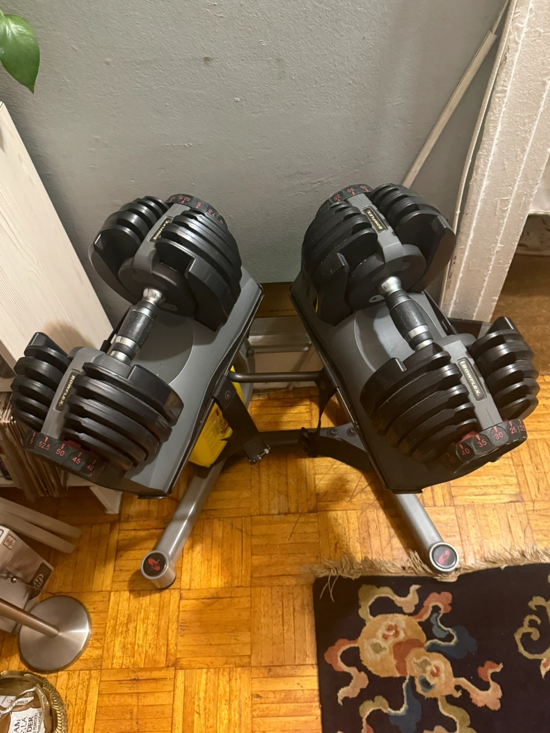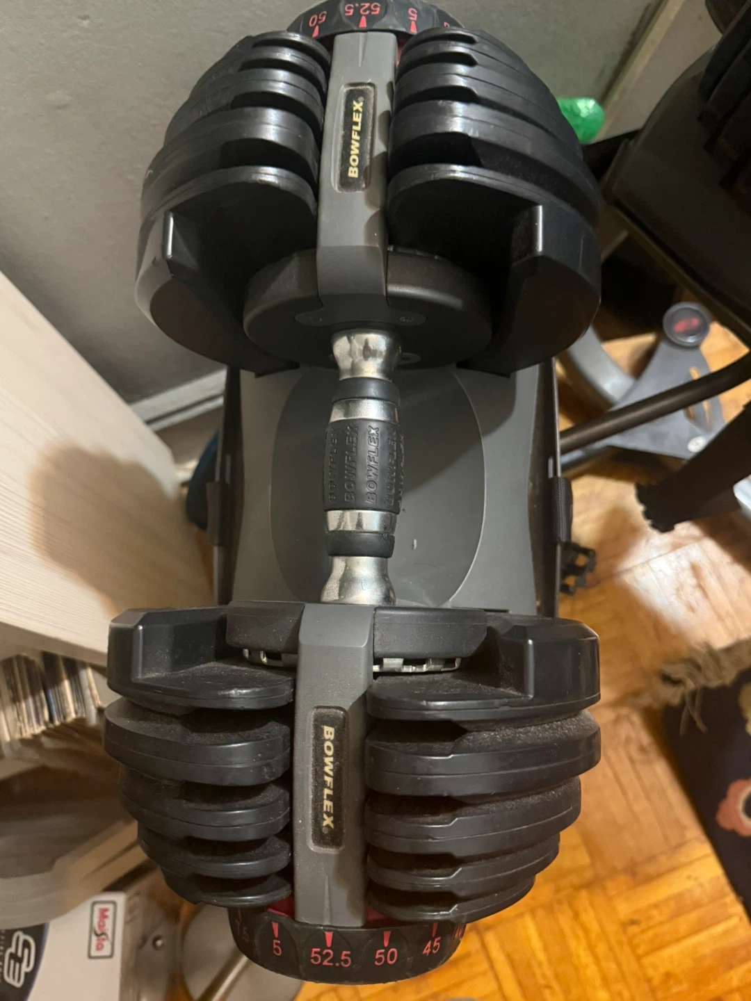 These are a pair of Bowflex SelectTech adjustable dumbbells. Each dumbbell adjusts from 5 lbs to 52.5 lbs. They come with their bases for adjustment and storage.