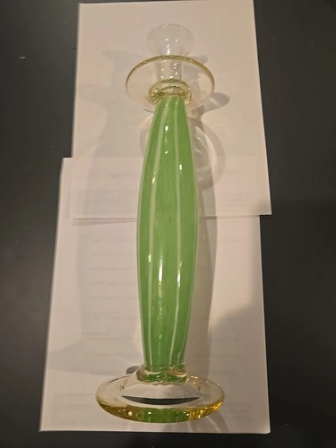 This Green White Twist Murano Style Hand Blown Art Glass Candleholder is a stunning piece of decorative collectible, perfect for all occasions. Standing at 14 inches tall, this medium-sized candle holder features a beautiful swirl pattern in green glass, with a glossy finish. Hand-blown using art deco style, this original piece exudes an artistic and elegant charm that will enhance any room's ambiance. Made of high-quality glass, this candle holder is sure to be a standout addition to your decor collection.